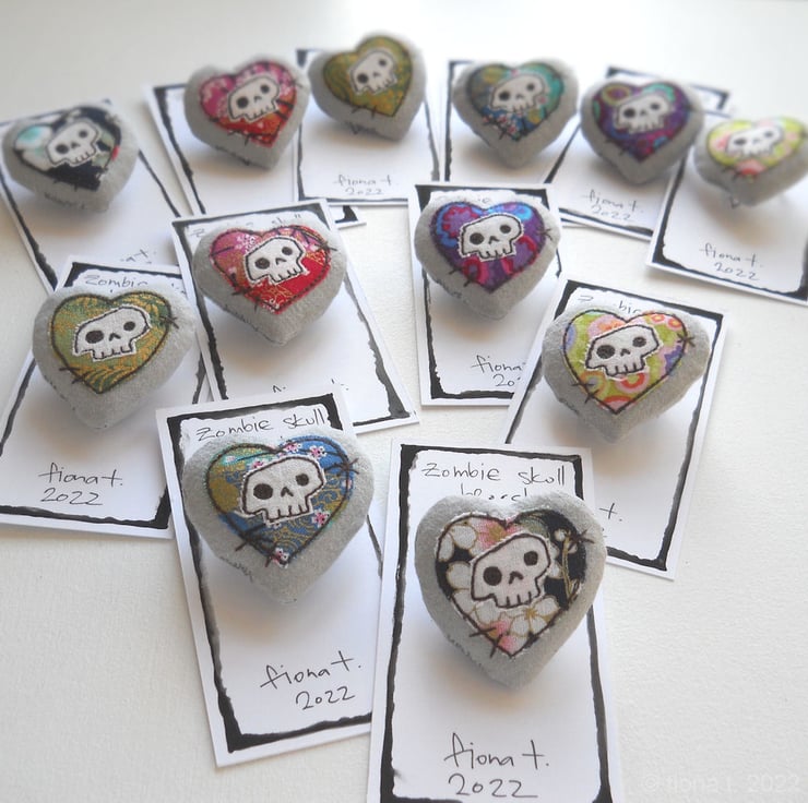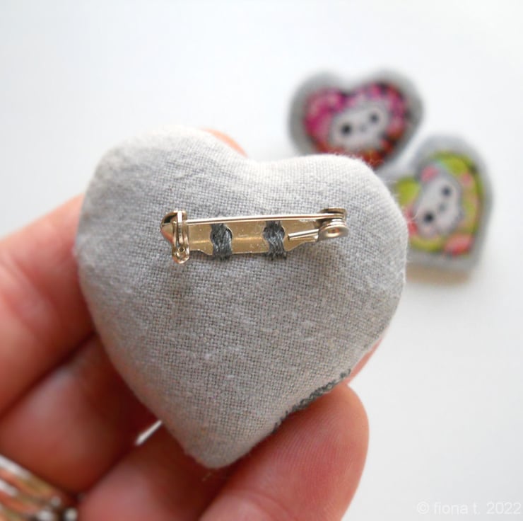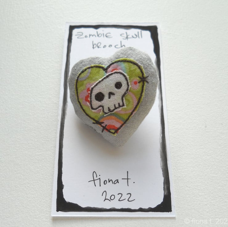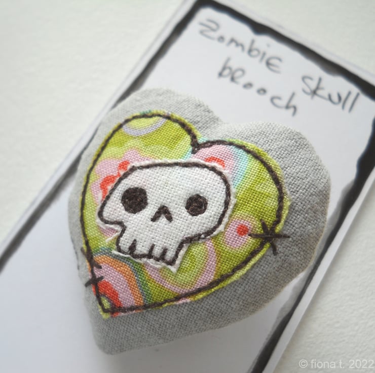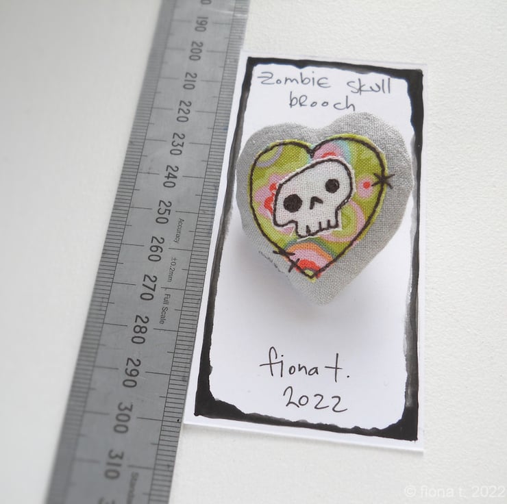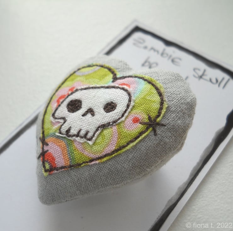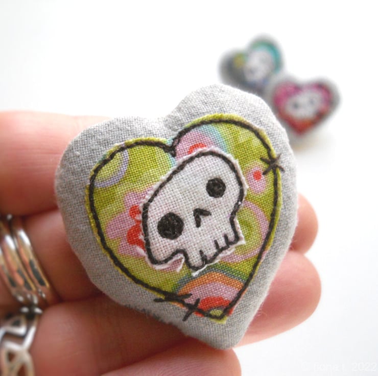 squishy skull heart fabric brooch or pin, measuring about 4cm.