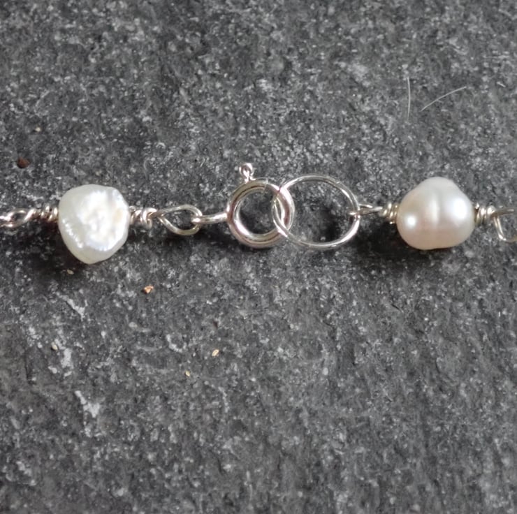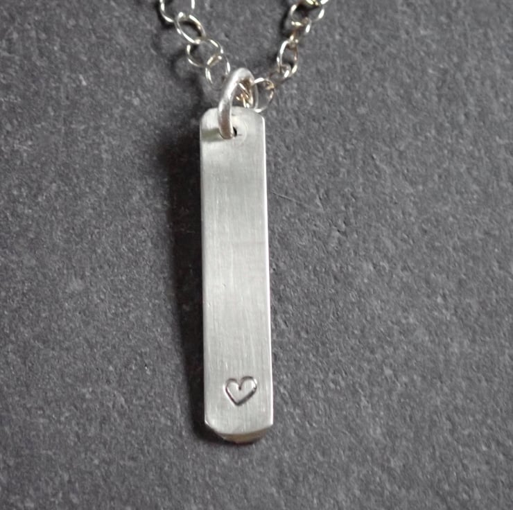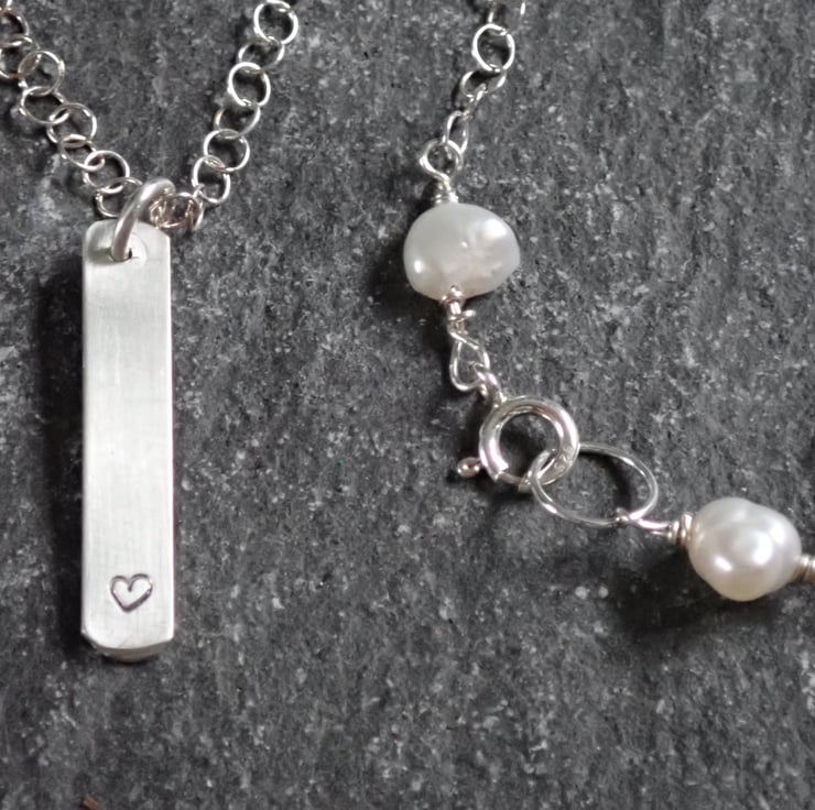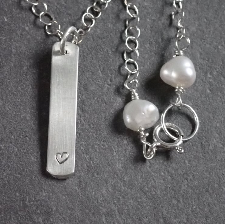 This is a sterling silver necklace, stamped with a cute heart and cut into an organic rectangular shape. It measures approximately 3cm long and 0.5 cm wide and is hung on a circle link sterling silver chain. I have used freshwater pearls to secure the chain to a spring ring clasp.