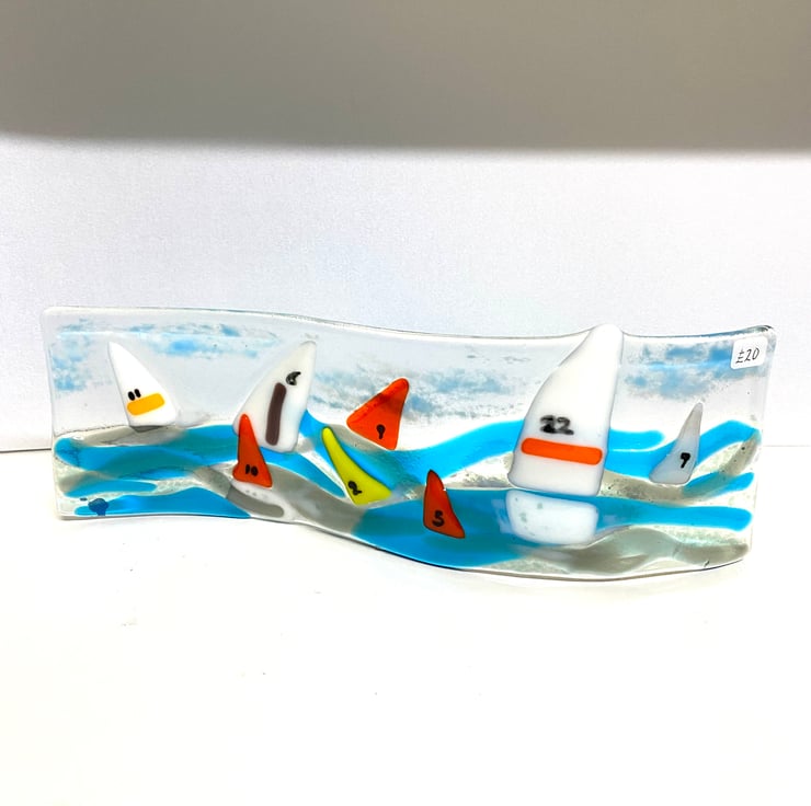 Fused glass sailing boats in colourful fused glass make this stand up ornament perfect for that person who loves to sail . Approximately 3.5 inch high x 12 inch long . There is nothing defective about this product . It was a sample for a larger piece