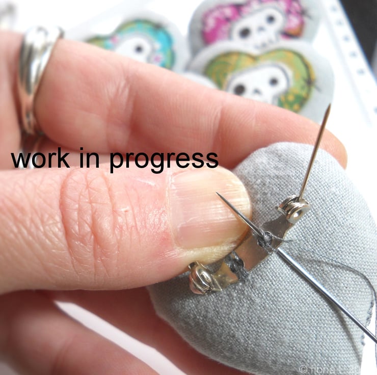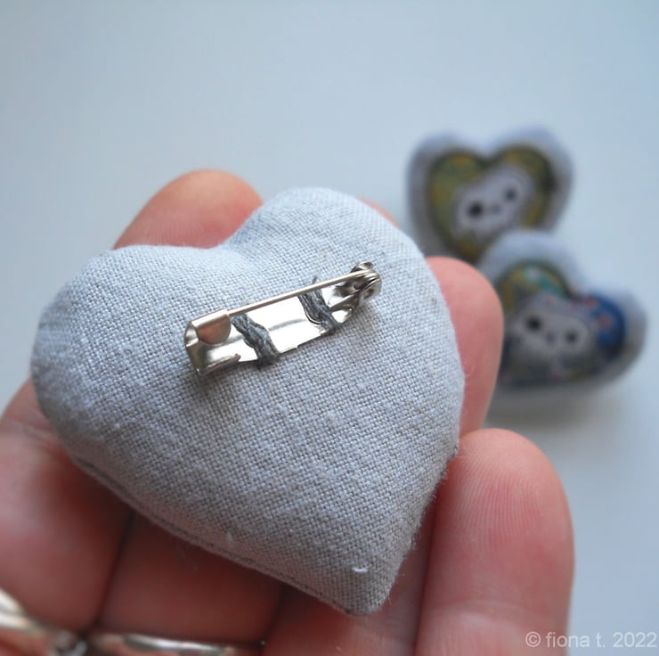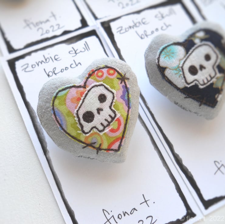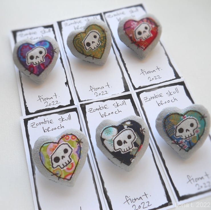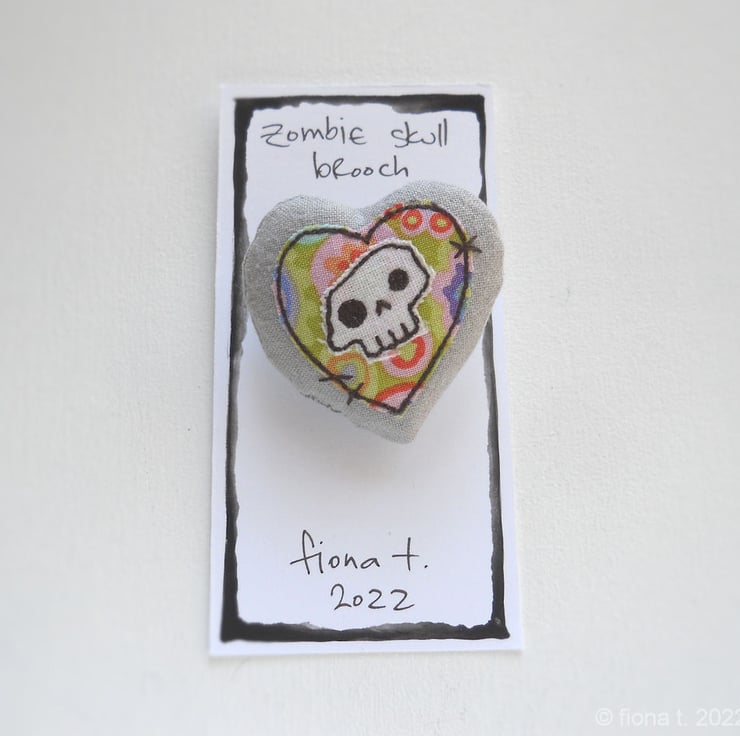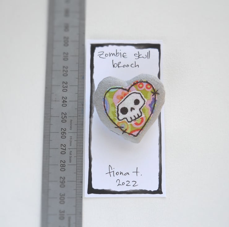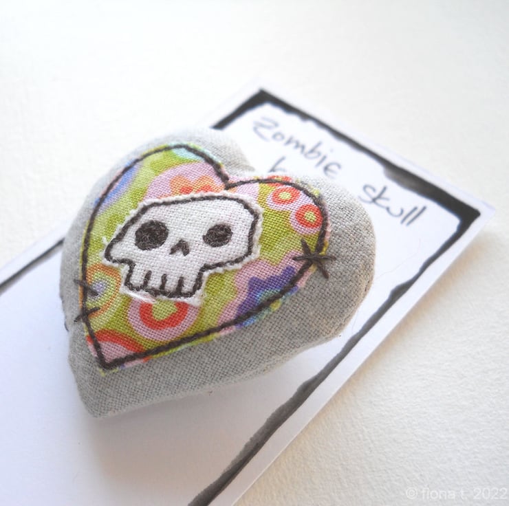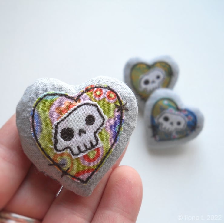 squishy skull heart fabric brooch or pin, measuring about 4cm.