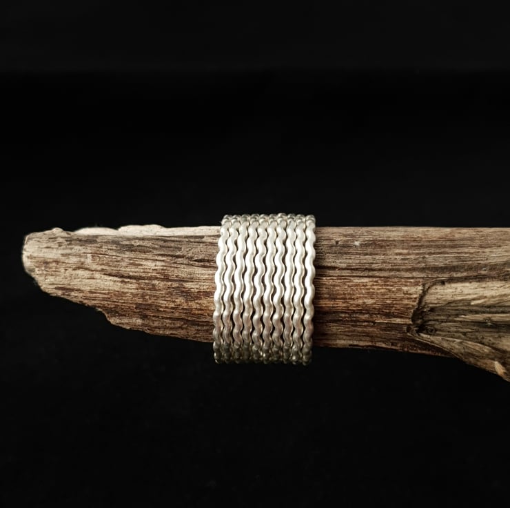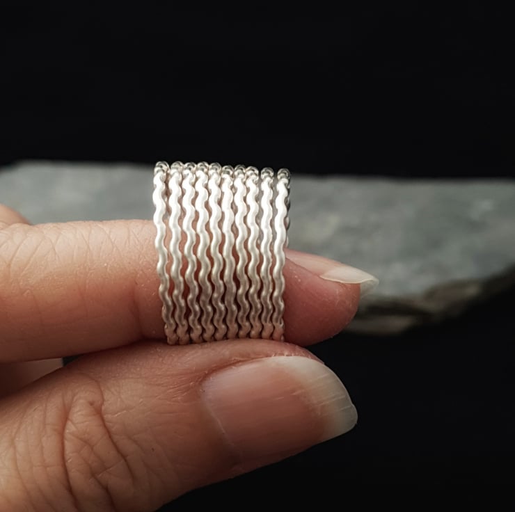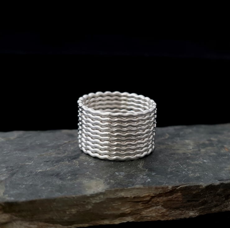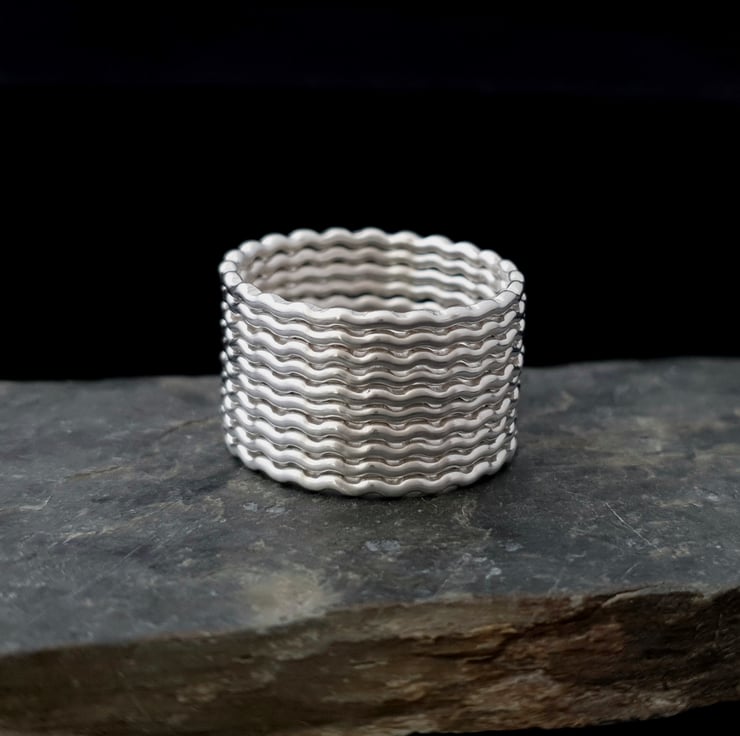 This multi-band stacking ring has been inspired by my visits to Cornwall, its shape resembles ocean waves. It has a pearly white satin finish, which I particularly love. It consists of 10 separate bands, each one fitting perfectly with the wavy pattern of the next making an impression of one single wide band. The ring has been made by hand in recycled Argentium silver 935, which is a type of sterling silver without copper and with higher content of pure silver than your usual sterling 925. Argentium is therefore hypoallergenic and suitable for those who are unable to wear traditional sterling silver. Argentium silver is also brighter / whiter in colour.