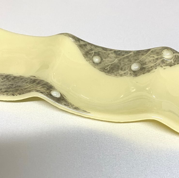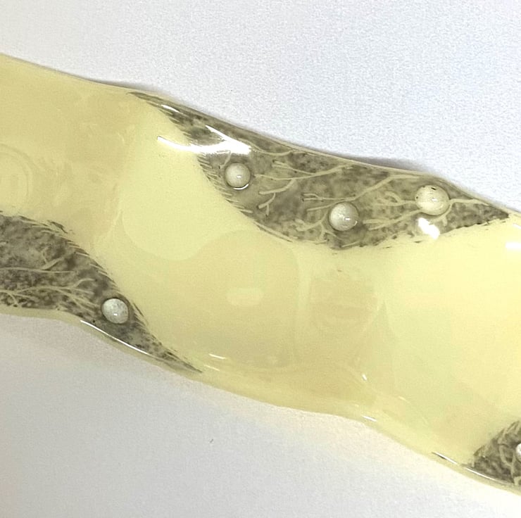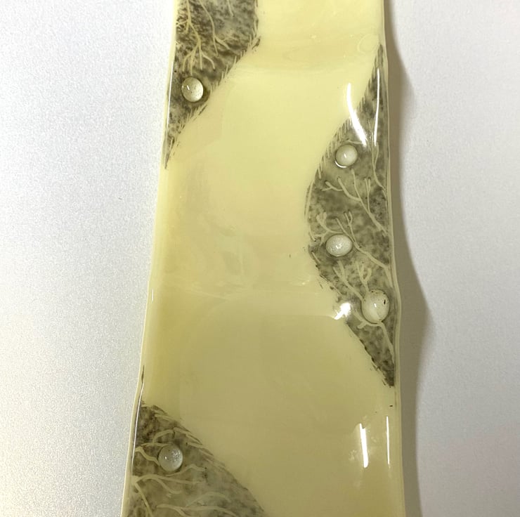 Gorgeous cream and grey tray dish with three small dishes in one ! The leaf design is hand enamelled and fused within my kiln and the shape is created by gently heating over a mould. This pretty tray could be used on a dressing table for trinkets or in the lounge for candles or even small nibbles.