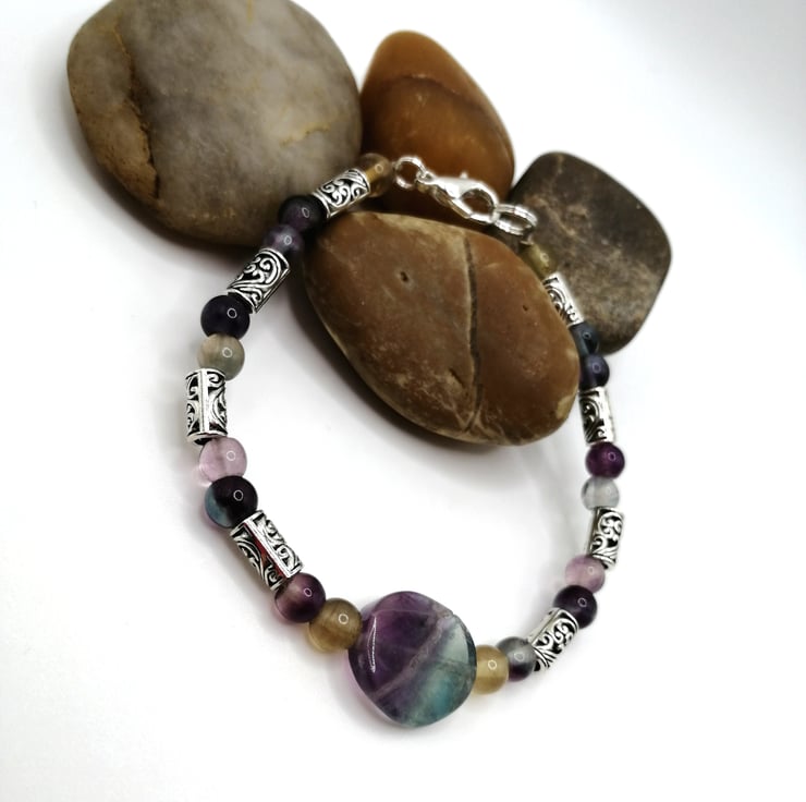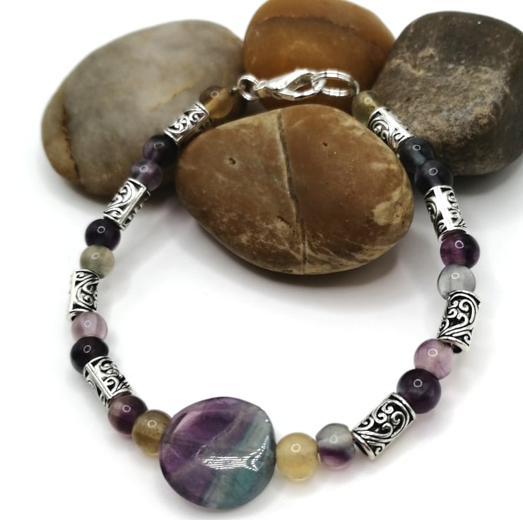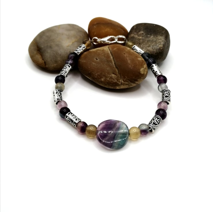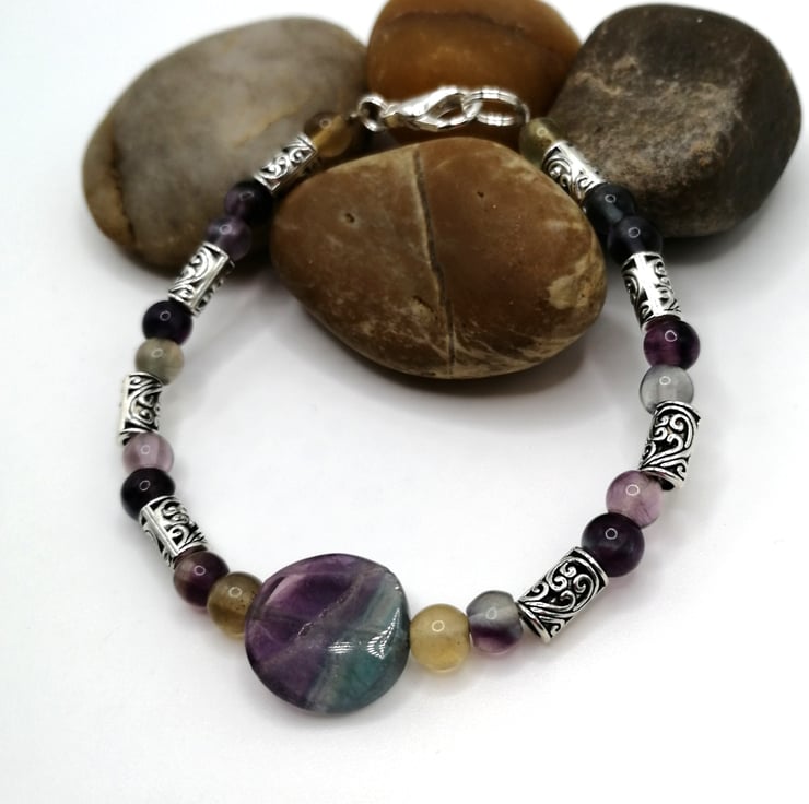 This wonderful bracelet is made with fluorite and silver plated beads. Please leave me a message with your choice of length. If I do not receive a message I will send as pictured.