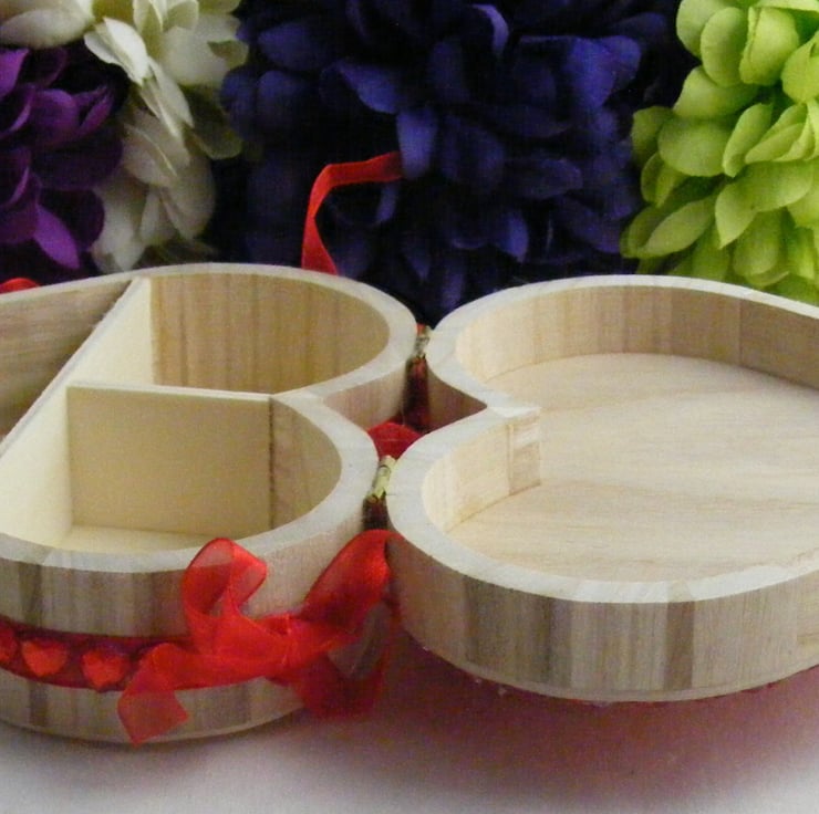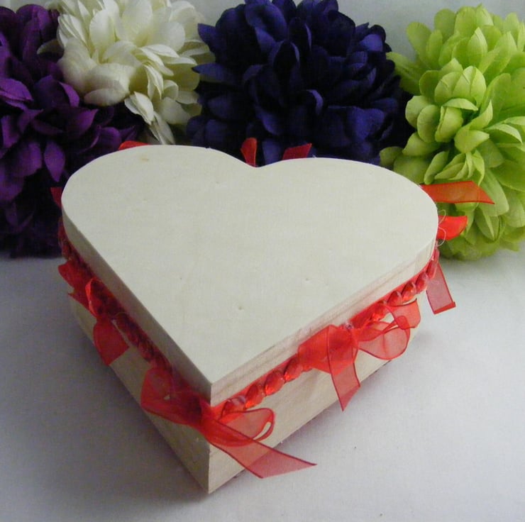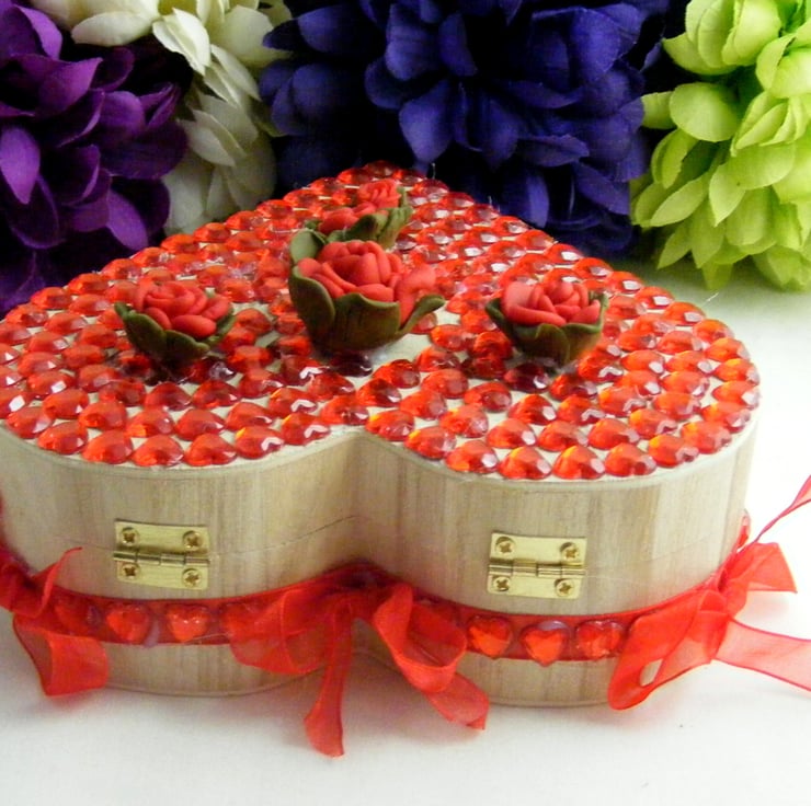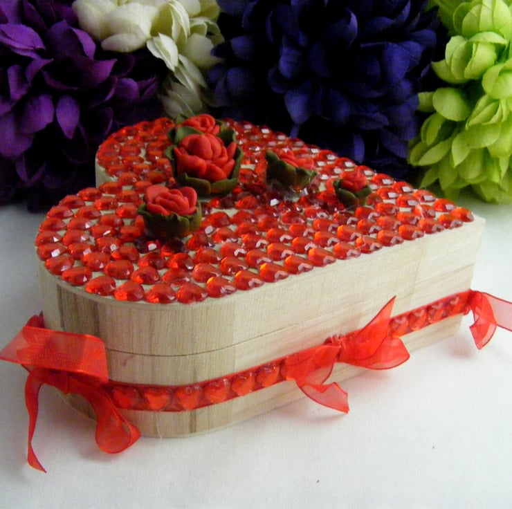 I've handmade this lovely box with a, 16 x 17 cm wooden heart shaped box, 10 mm red acrylic hearts, 35 mm, 27 mm and 19 mm polymer clay rose which I've handmade myself. Red organza ribbon, and glue.