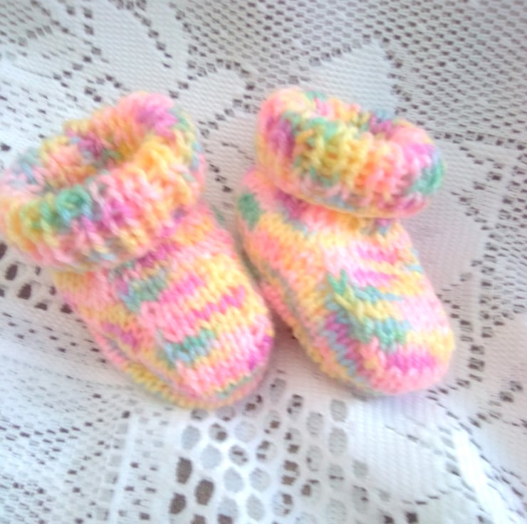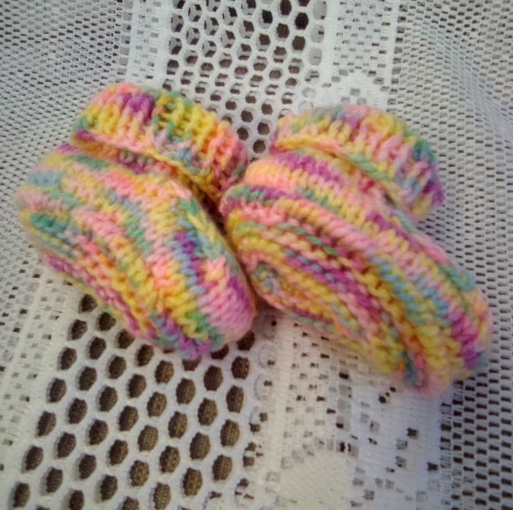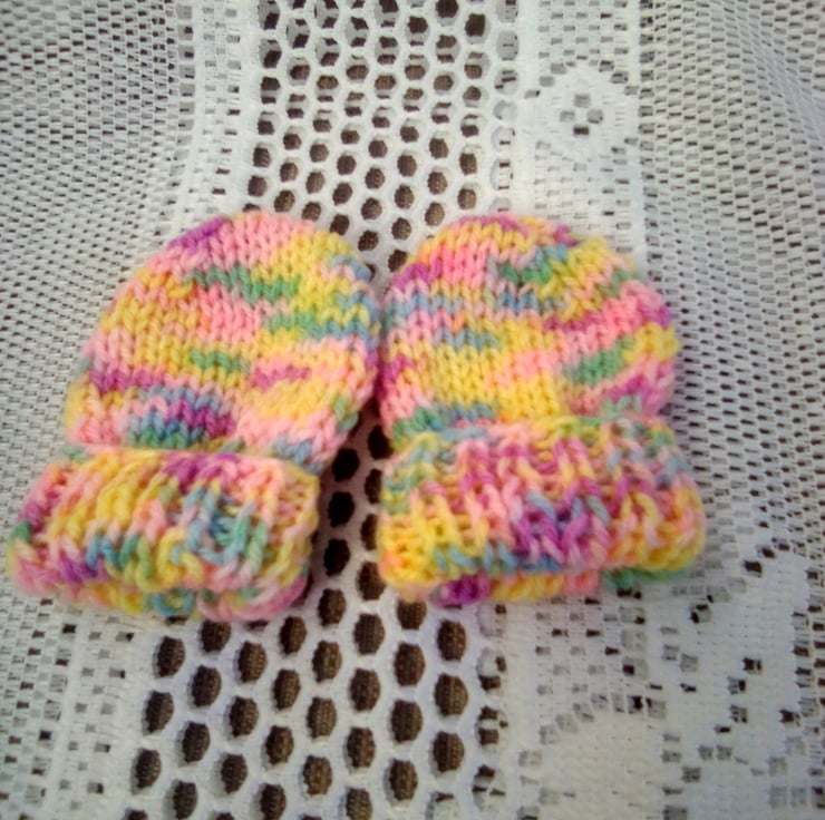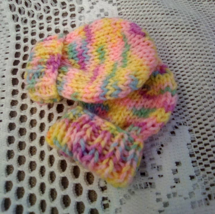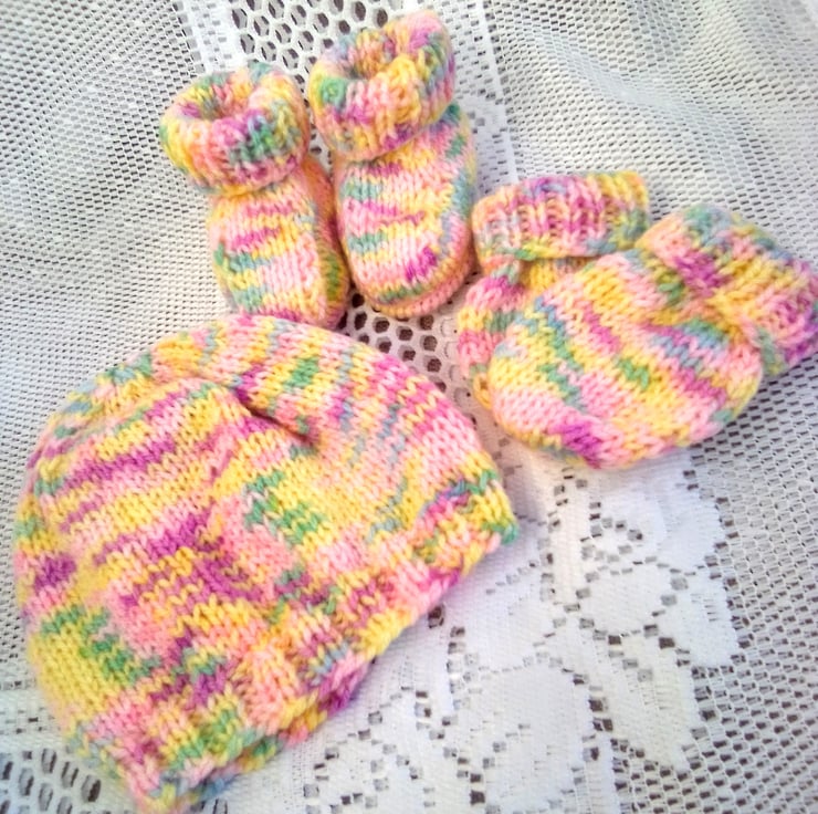 Variegated Pink and Yellow 3 Piece Hat Set for Baby, Hand Knitted Hat Set, Baby Hat, Baby Mitts, Baby Booties, New Baby Gift, Baby Shower Gift, Baby Accessories