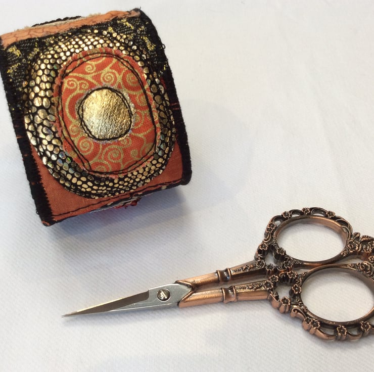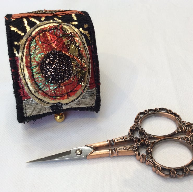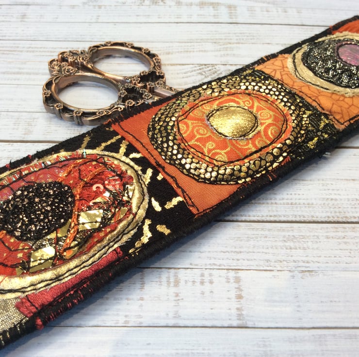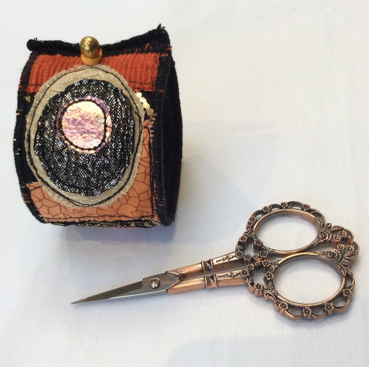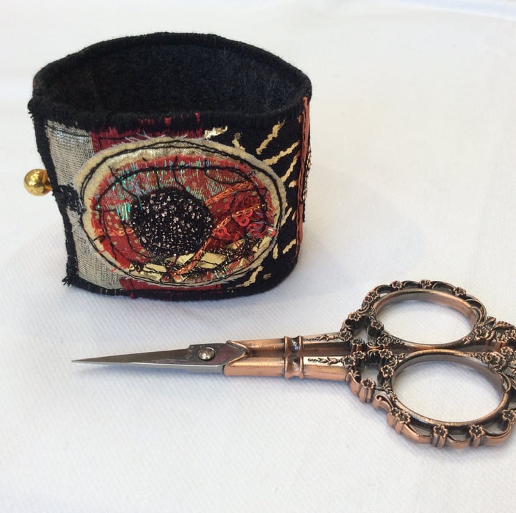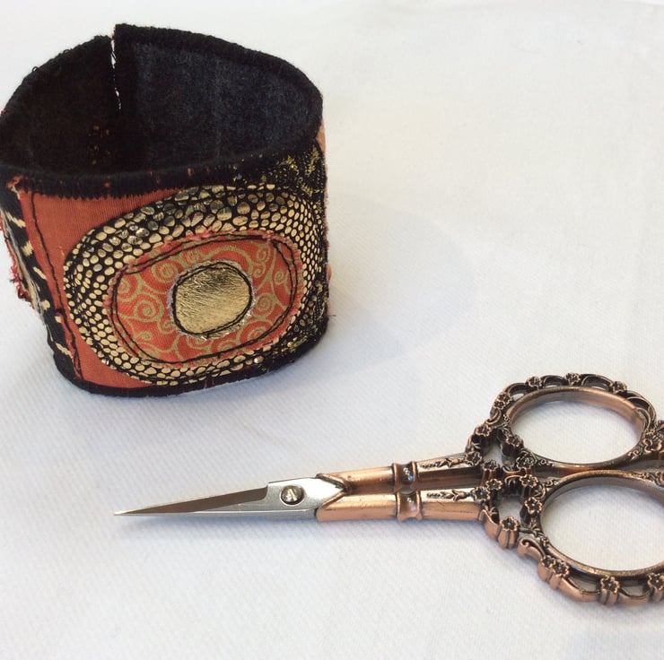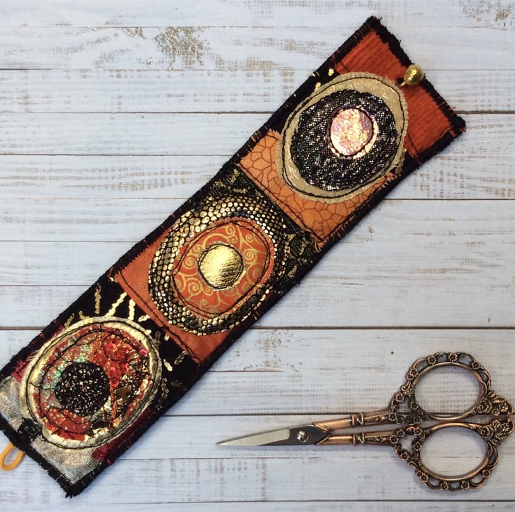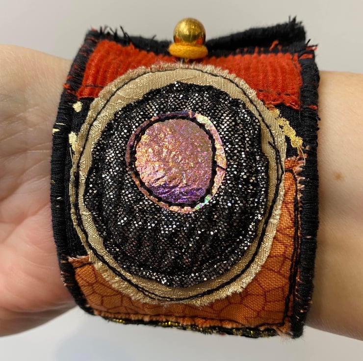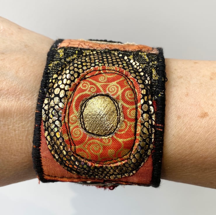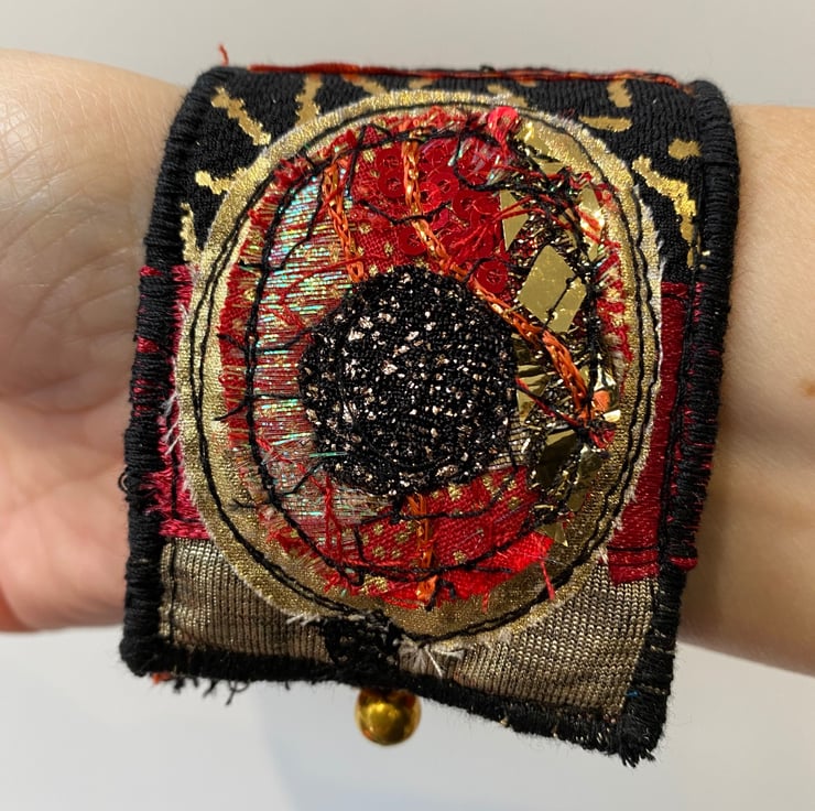 This dramatic cuff has been made with up-cycled fabrics and free motion embroidery. The pattern is in the style of Gustav Klimt. There is a up-cycled solid 3-d gold button at one end with a loop at the other to keep it firmly in place. It’s lined with wool. Inside is recycled plastic milk carton to help support the shape. It measures 21 x 5.5cm approx.