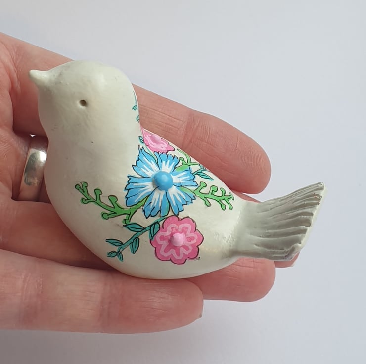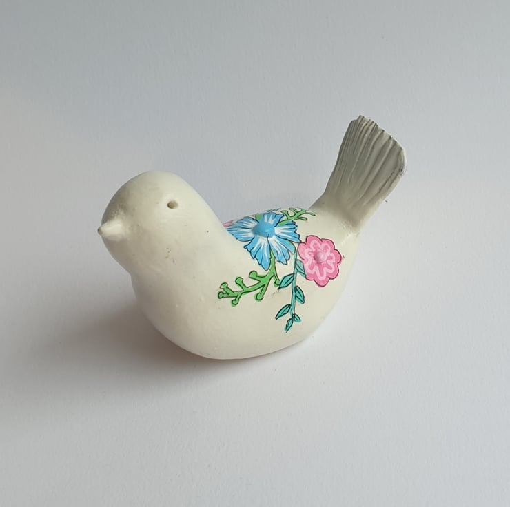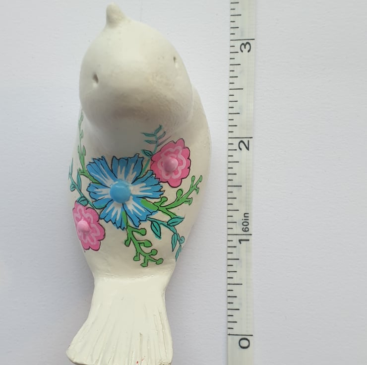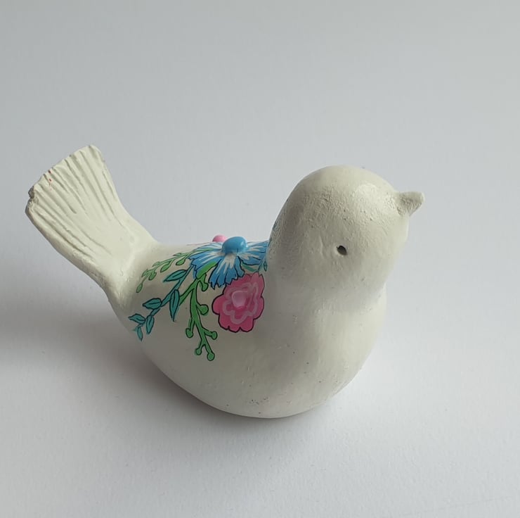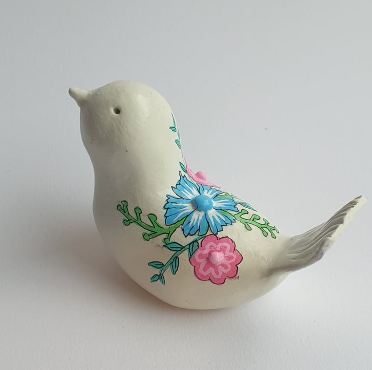 ull of character, this unique little bird has been sculpted by hand in Air Dry clay, sanded and painted in Acrylic paint then finished with a glaze sealant. Featuring colourful flowers and stems design. Would make a wonderful gift for someone or a little treat for yourself.