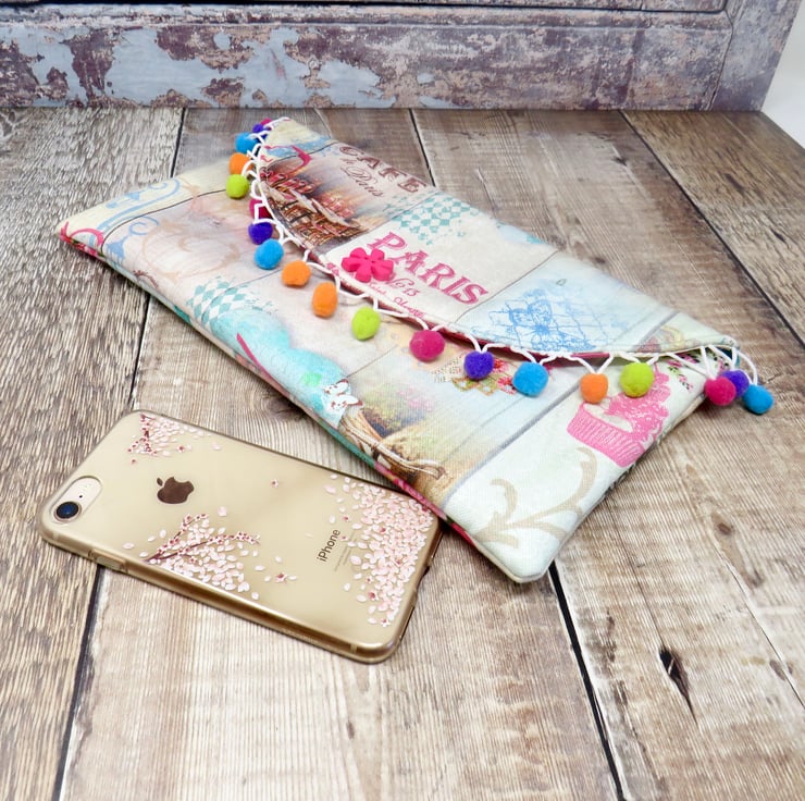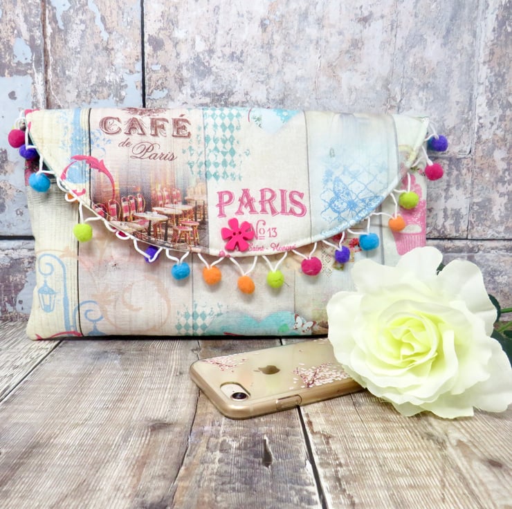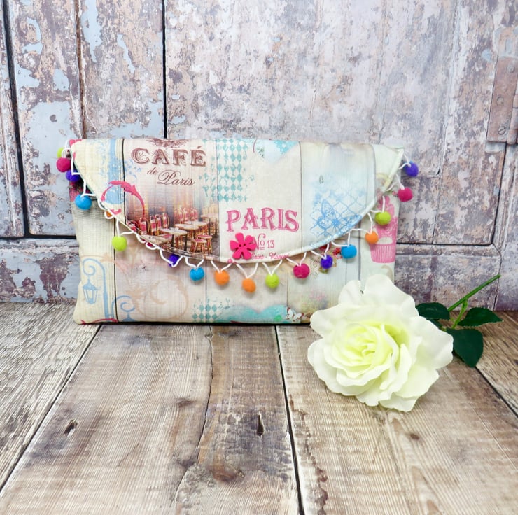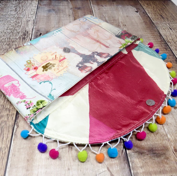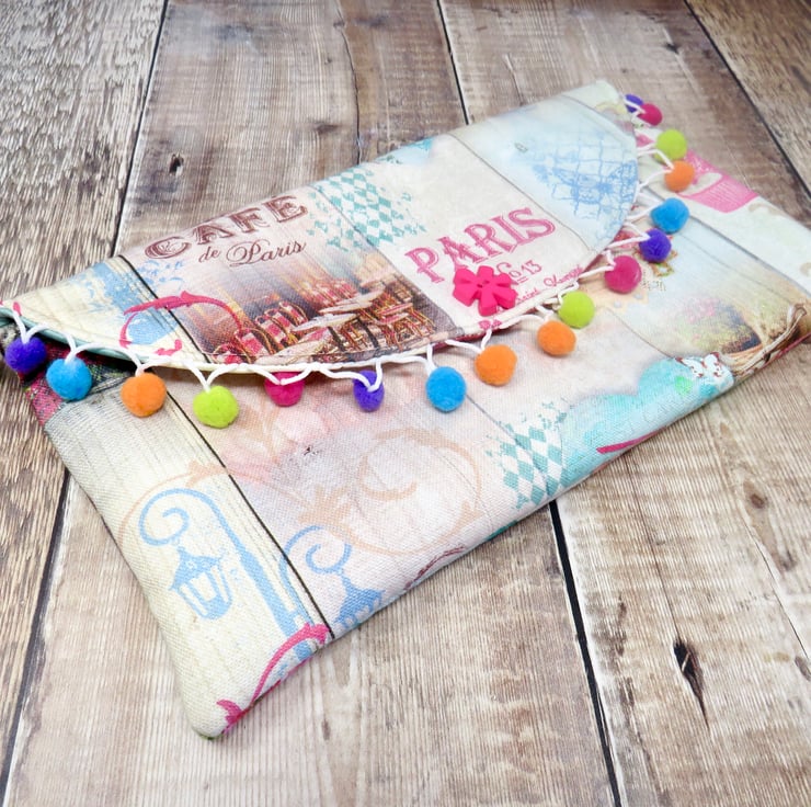 A colourful and fun one of a kind clutch made using a Paris themed fabric. It has a multicoloured pom pom trim on the flap and a funky flower button. Lined in an abstract print silk it has a small slip pocket and fastens with a magnetic snap.