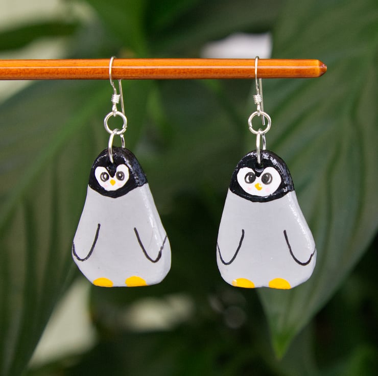 Cute little baby penguin earrings, perfect for a cute winter outfit, or any time of year. The earrings have been handmade from air-dry clay and then painted with high quality paint. A gloss varnish has been applied to the front and back which makes the earrings water-resistant, however, I would not risk them being totally submerged.