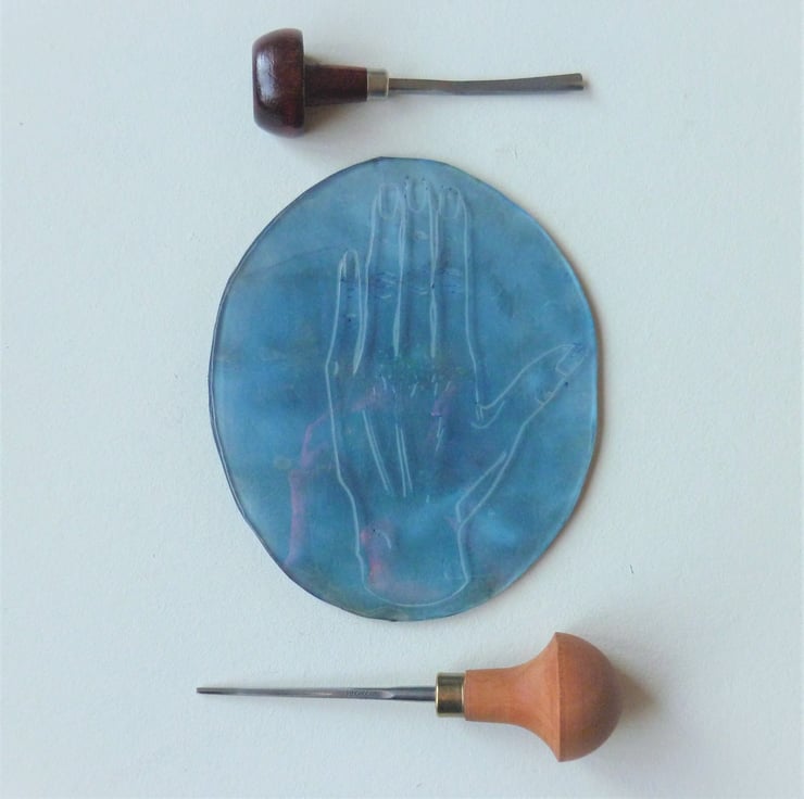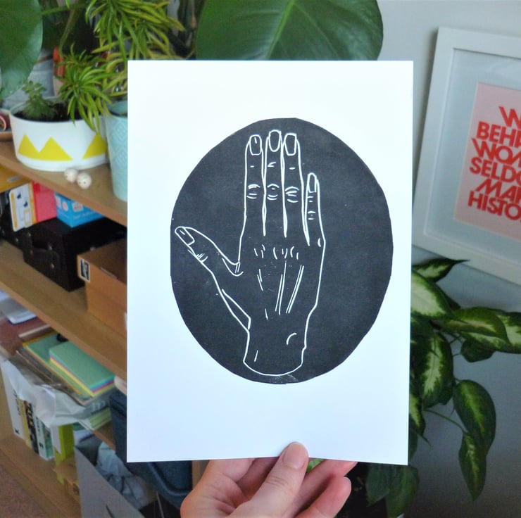 There's not really a story behind this one, I'm afraid - I just love drawing hands and thought I'd try to lino print one! Turns out, it's not as easy as it sounds but I do love the impact of the black background against the white paper.