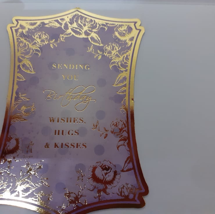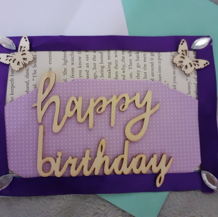 This card started life has many other different items. The backing paper is a recycled page from an old book. Mounted on top of the page is card from a tissue box. Which is then covered in an eye catching design of a lilac with miniture white dots. This is all boarded within a recycled purple ribbon. Upon the main structure of the card there are wooden butterflys in the top corners of the card. In each corner there is a clear teardrop gem stone. Mounted upon the purple and white design there is a wooden presentation that reads "happy birthday". The card is an adorable 3d birthday card that any receiver will love on their special day.
