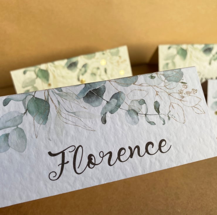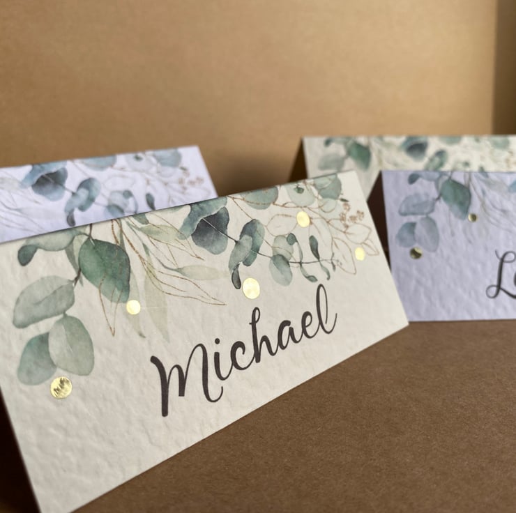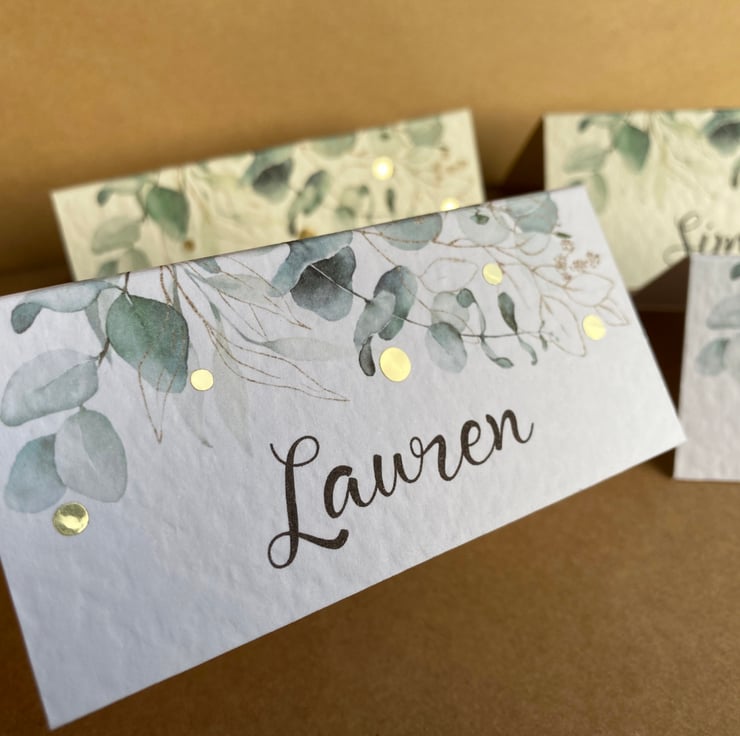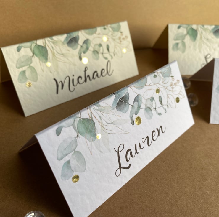 Calligraphy style font, eucalyptus greenery edge design with or without metallic gold dots.