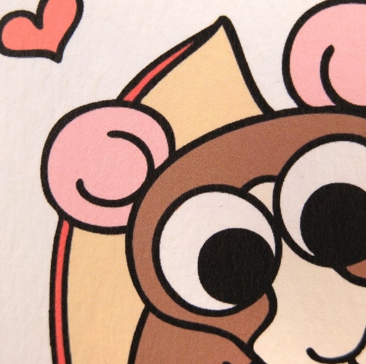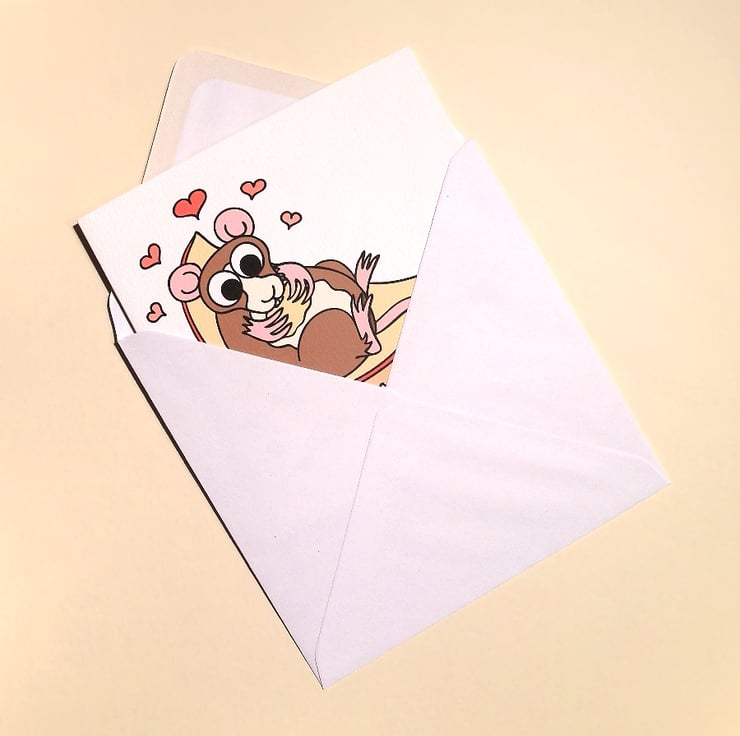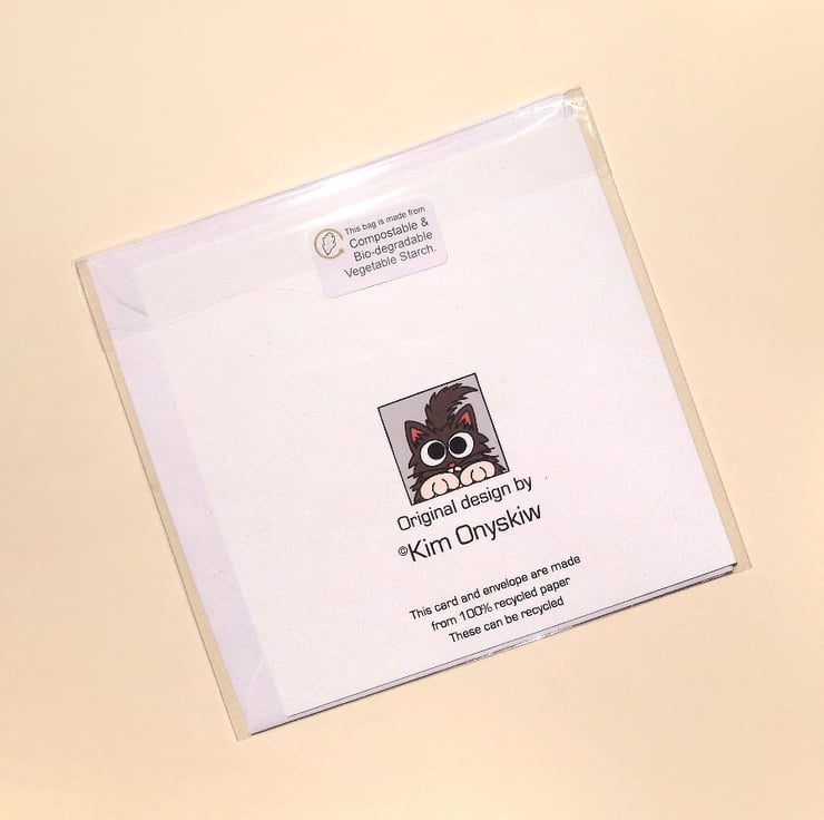 The cute rat design by Kim Onyskiw is printed on a 14cm (5.5") square white card with a 270gsm weight, and comes with a white envelope. Both the card and envelope are 100% recycled. The cheese lover's card will be packaged in a bio-degradable and compostable vegetable starch bag to keep it protected in the post.