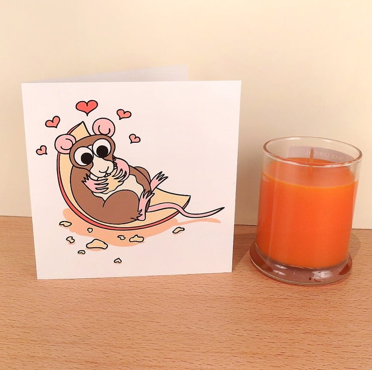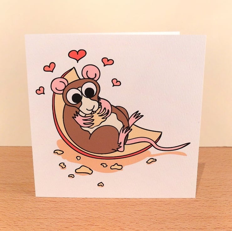 A cute love card featuring a cartoon brown and white rat relaxing on a slice of edam, as it happily eats its way through the beloved cheese. Little pink love hearts are shown appearing around the rat's head.