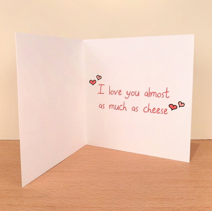 The message inside the card reads "I love you almost as much as cheese", making it a suitable card for a cheese lover to give on Valentine's day, an anniversary, or any other occasion when you want to show someone how much you love them (while still getting your priorities straight).