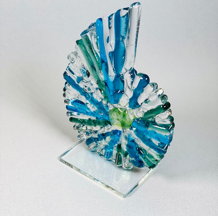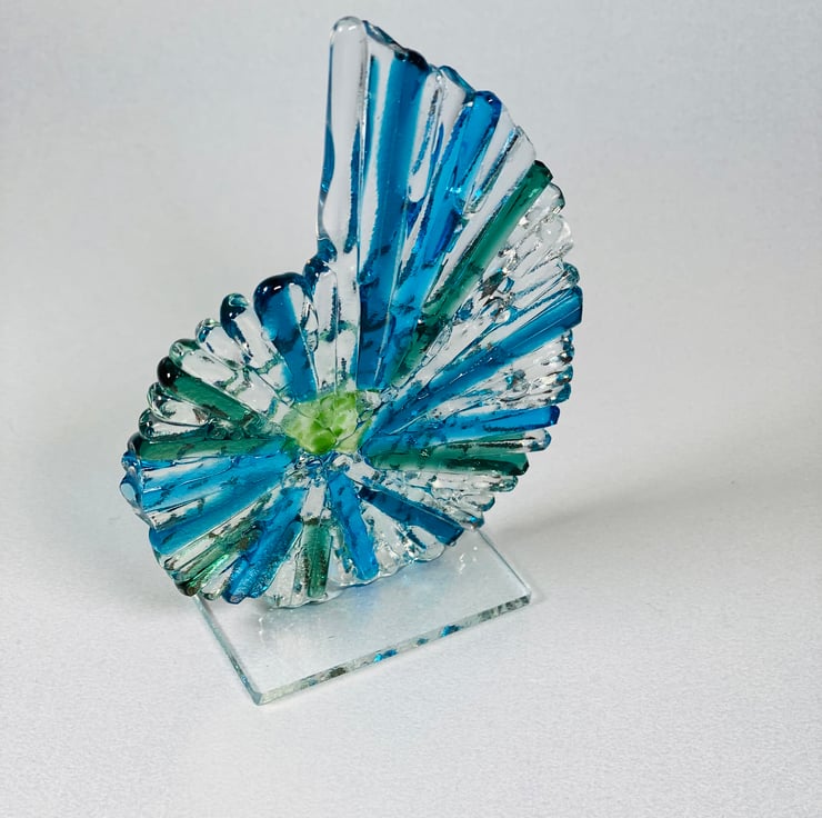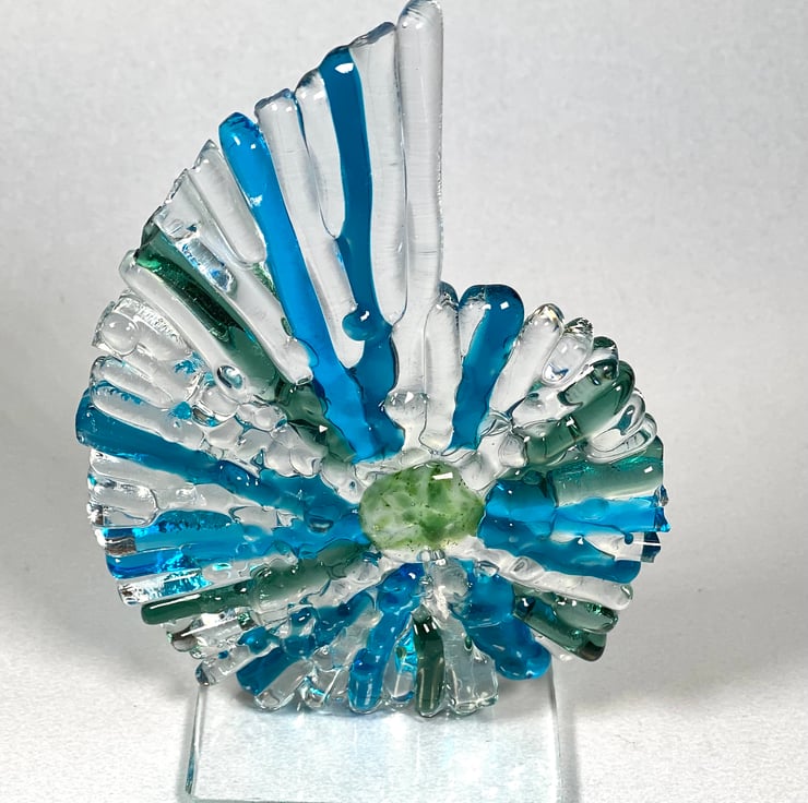 This gorgeous textural ammonite is the smallest in the range of fused glass ammonites I make . It stands at 4.5 inches x3.5 inch wide. All the glass is hand cut and kiln fired. A lovely original fused glass ornament for your home or as a handcrafted gift