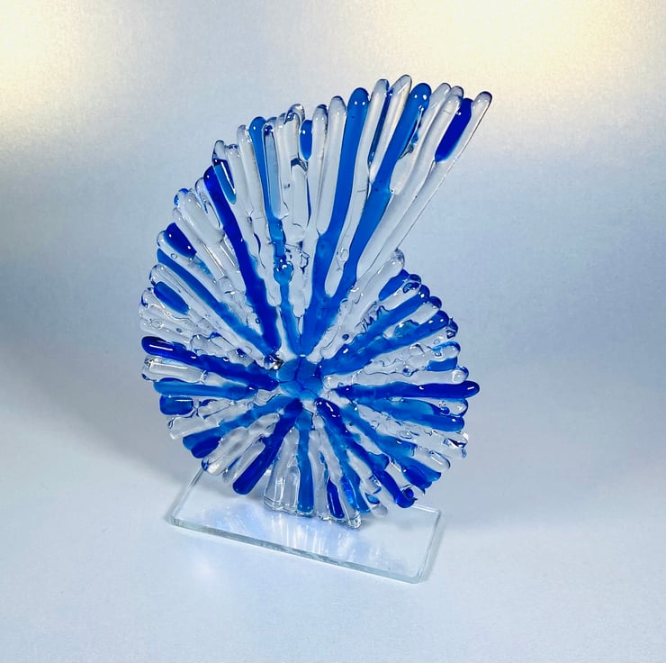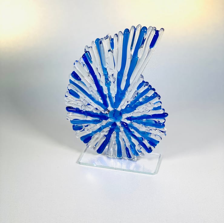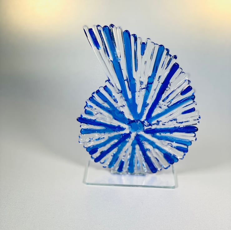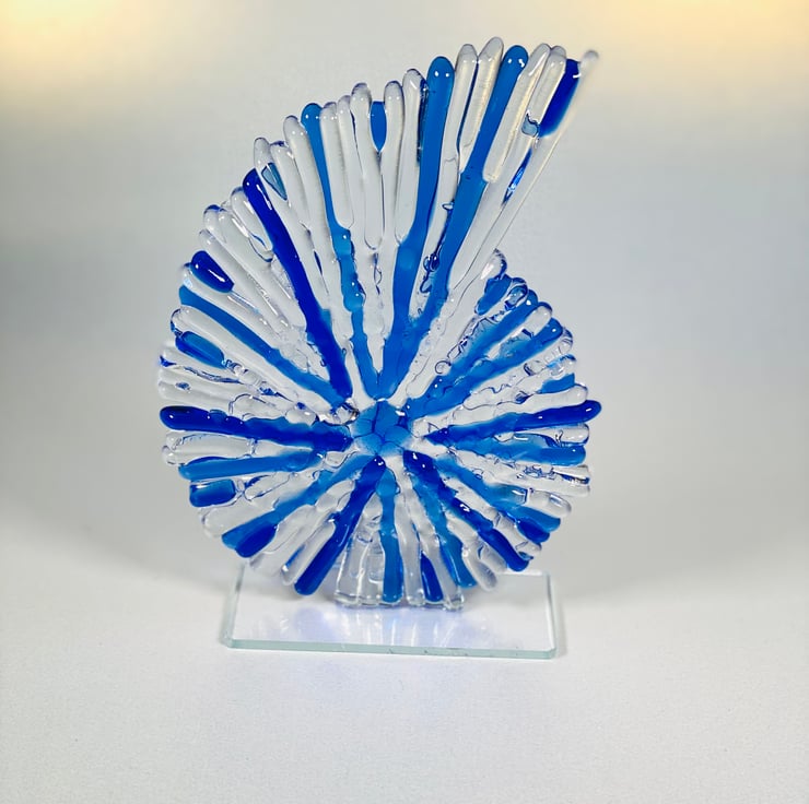 This beautiful glass ammonite is my mid sized version . Constructed of fused glass and kiln formed. All of the tiny strips are cut from sheet glass to give it a wonderful texture. The sculpture stands at aproximately 8 inches high . A beautiful statement piece for your home or a special gift . If sending as a gift I’m happy to include a personal note , just leave me a message . Lou xx PLEASE NOTE THIS ITEM IS MADE TO ORDER