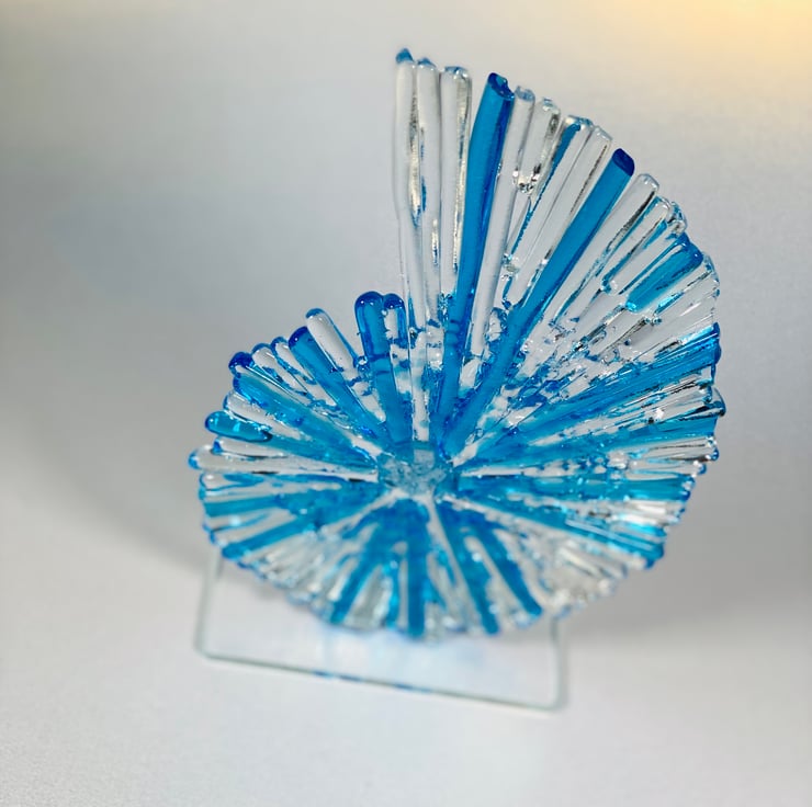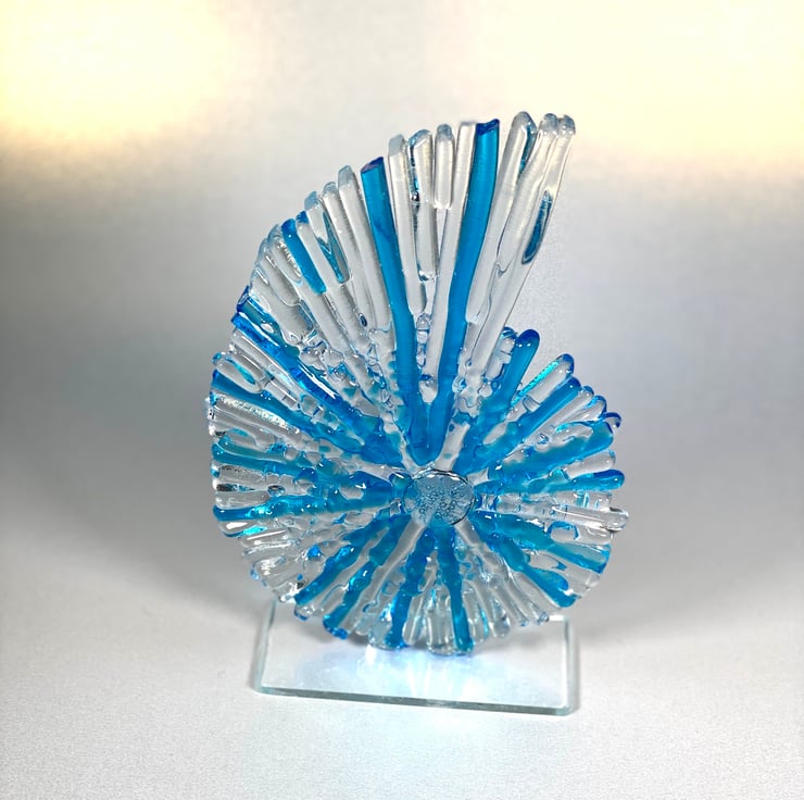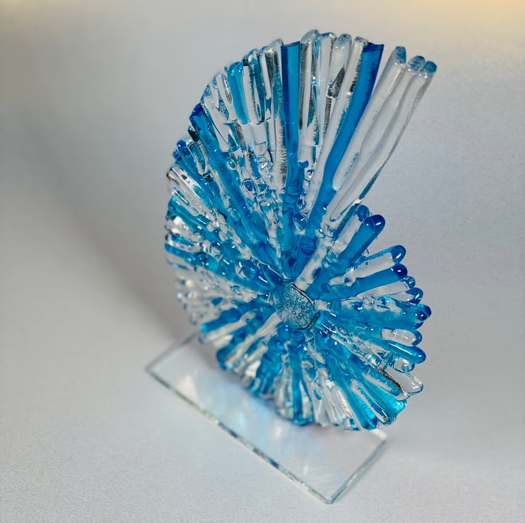 This beautiful glass ammonite is my mid sized version . Constructed of fused glass and kiln formed. All of the tiny strips are cut from sheet glass to give it a wonderful texture. The sculpture stands at aproximately 8 inches high . Each ammonite is unique so please be aware yours may not be identical but colours are the same .A beautiful statement piece for your home or a special gift . If sending as a gift I’m happy to include a personal note , just leave me a message . Lou xx please not this item is made to order