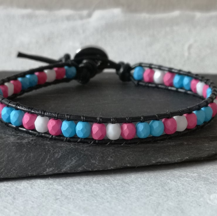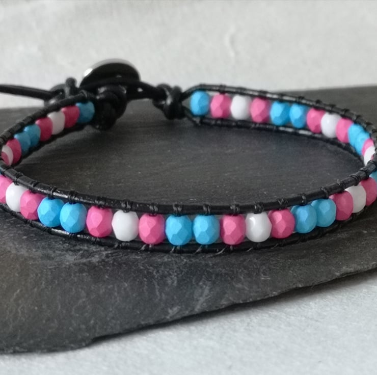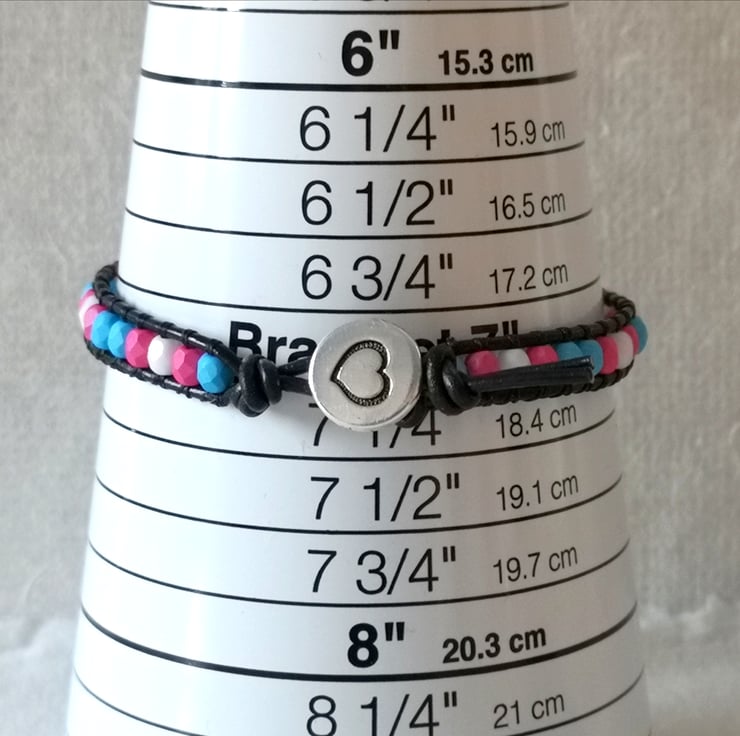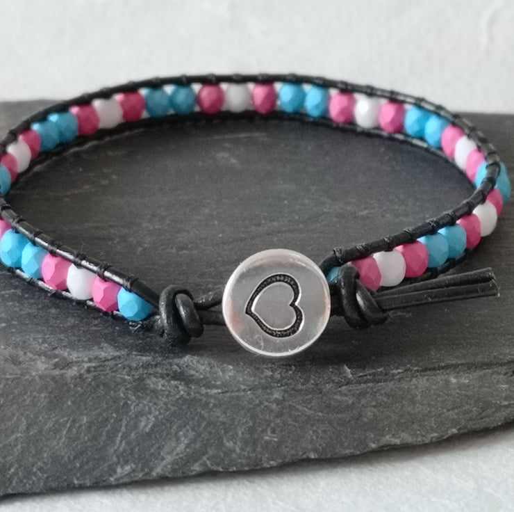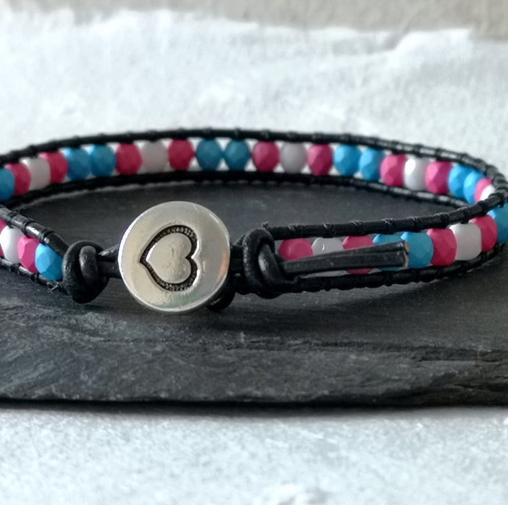 This simple bracelet has been made with soft black leather cord. Small glass beads in the blue, pink and white of the trans flag have been added, and a button with a heart motif has been used as a fastener.