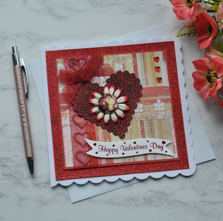 This mixed media design is a vintage style love heart handmade and encrusted with red glitter and adorned with my handmade flowers. The 3D sentiment greeting is red foiled and says Happy Valentines Day, and the card is finished with red ribbon, glitter and gems.
