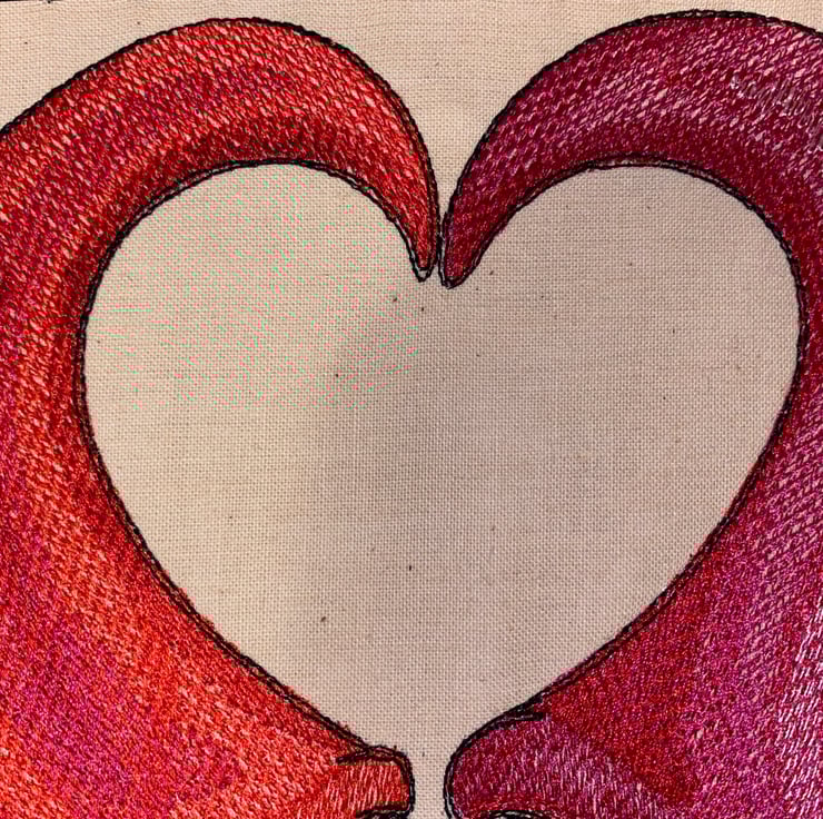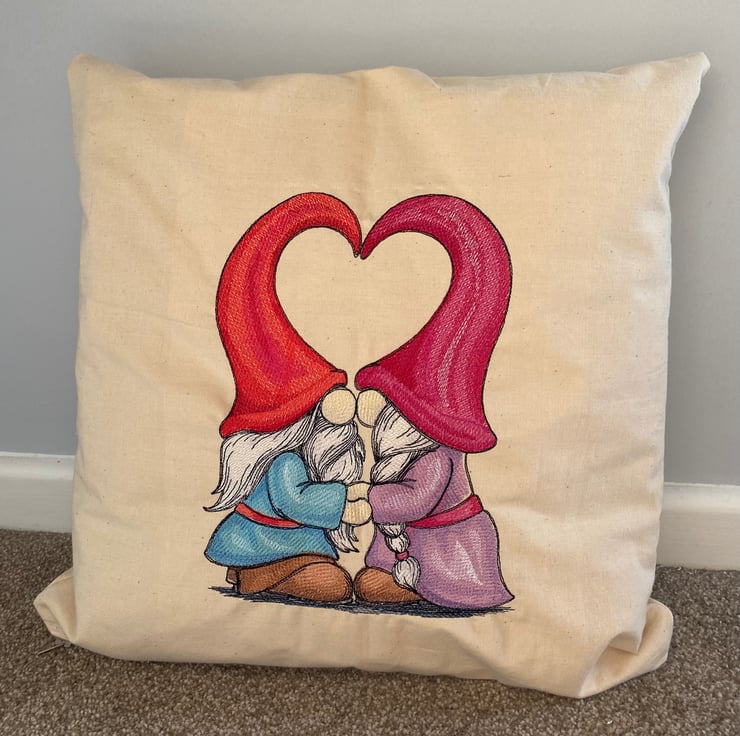 This cover has a pair of colourful Gonks embroidered onto a calico cotton fabric and has a zip closure on the bottom.