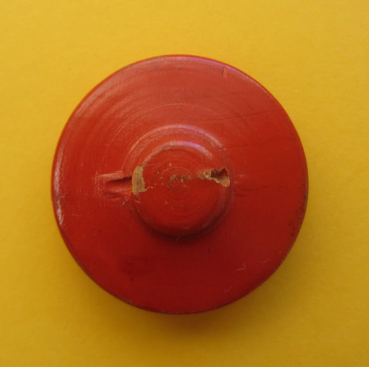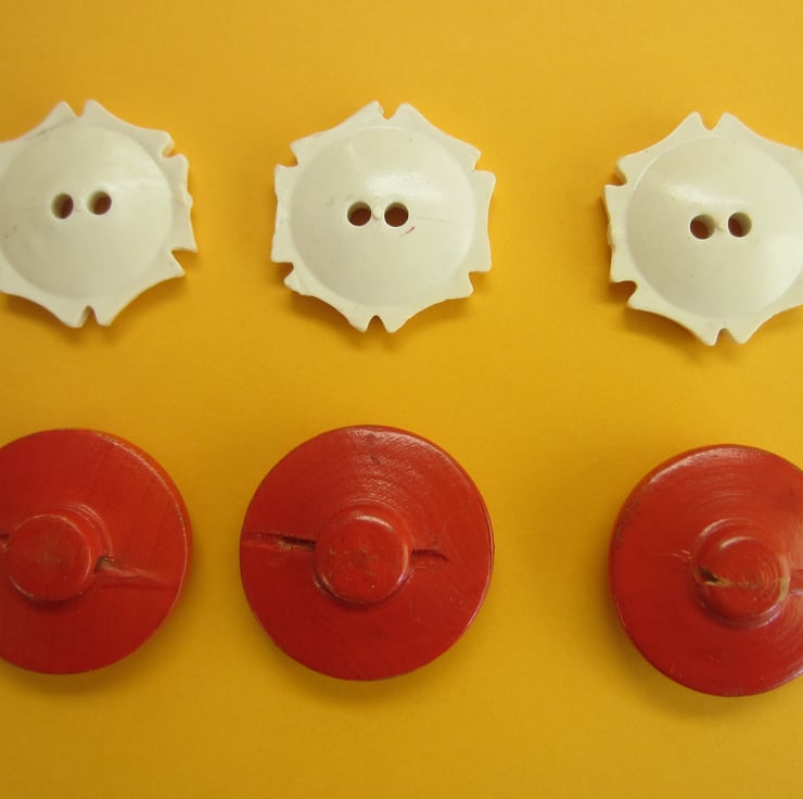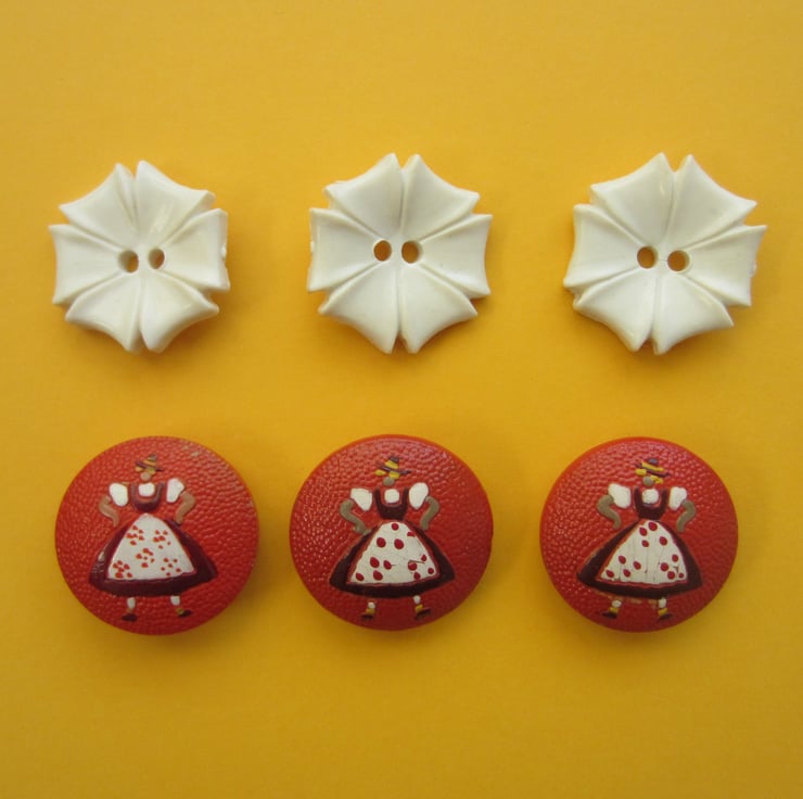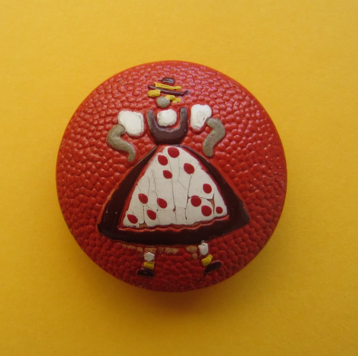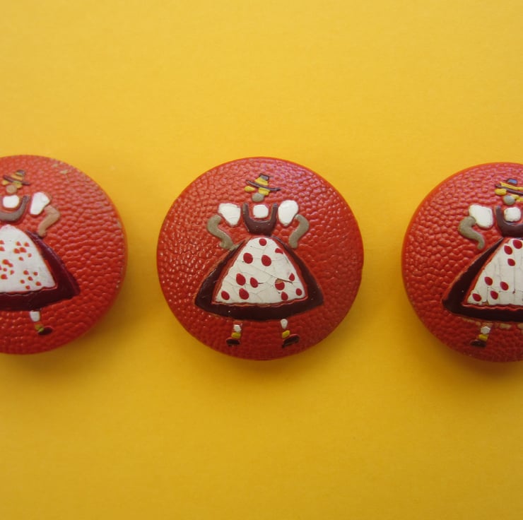 3 red buttons with a figure in Swiss or Austrian dress. They measure 2.7 cm (1 1/8 inches) across.