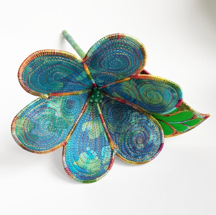 It has a flower with a glass bead in the middle, a green leaf coming out of the side and a wooden stem wrapped in green fabric.