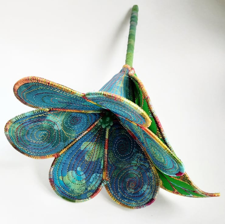 Made from layers of fabric including hand dyed Egyptian cotton and silk fabrics using the free machine embroidery style of sewing
