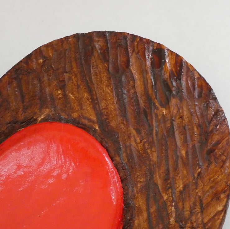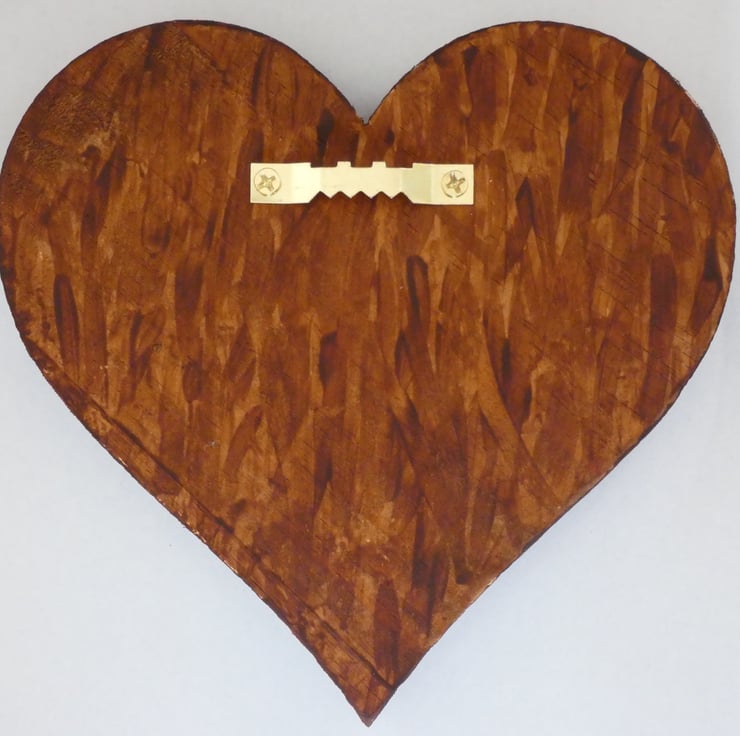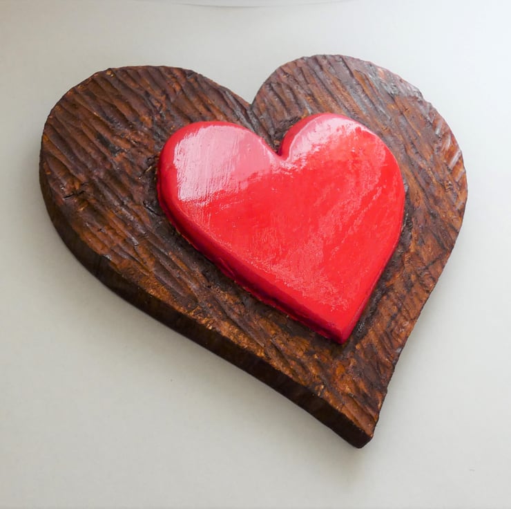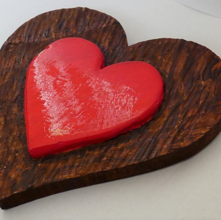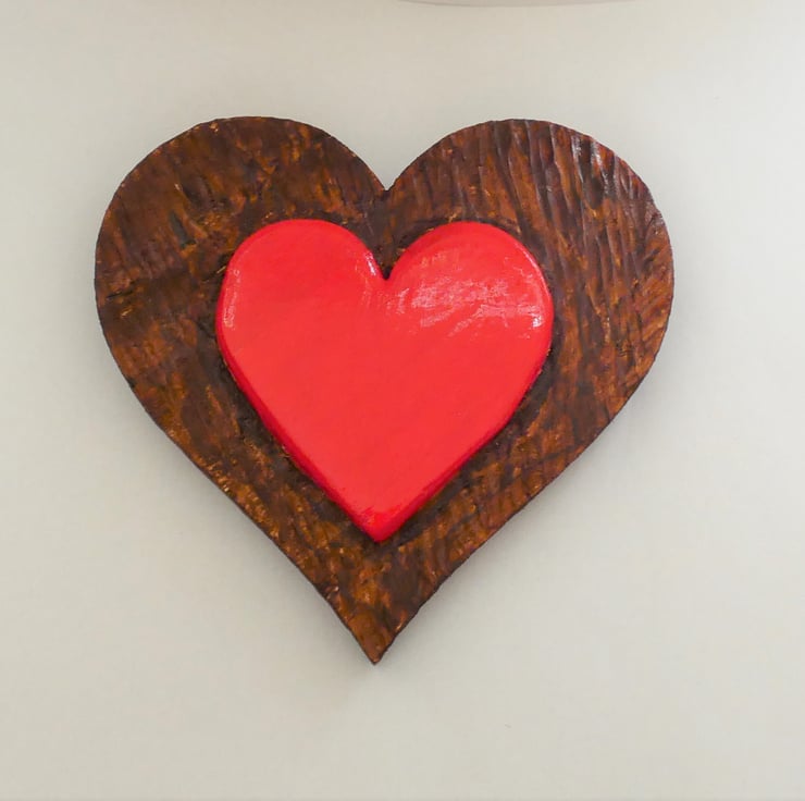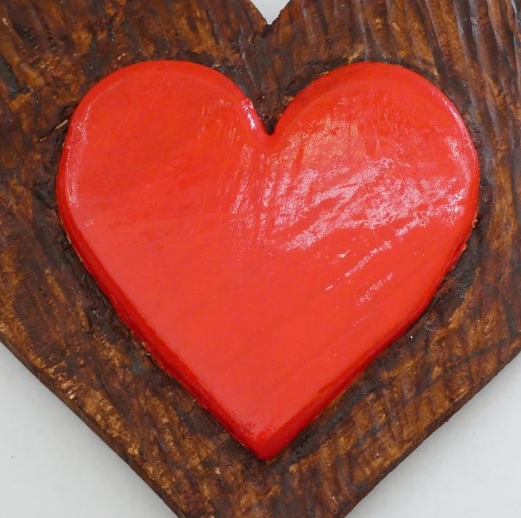 A piece of wood was selected and cut to accommodate the size of the external heart. The external heart was cut using a bandsaw following a design. Using carving knives I then handcarved the central heart and the tree bark effect. Next I painted the carving with acrylic paint before coating it with several coats of lacquer to protect it. The lacquer used is water and heat resistant, and toy safe. A picture mount has been added to the back of the heart to allow for hanging.