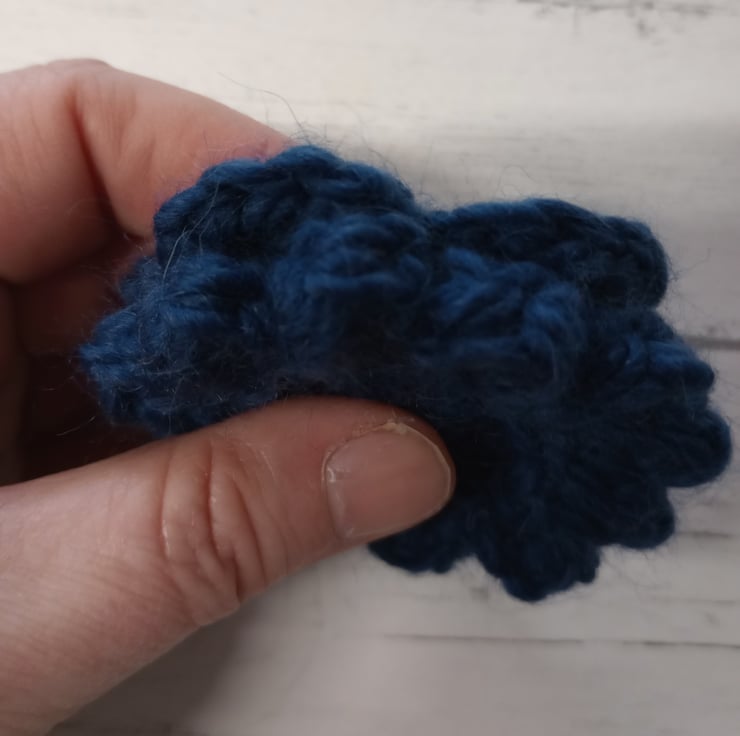 It features two layers in the same navy bluen yarn, with a silver brooch clasp sewn on to the back.