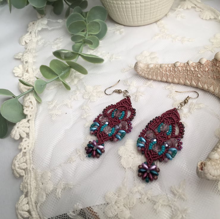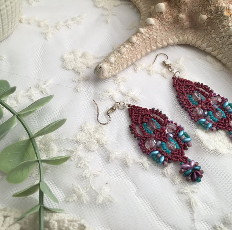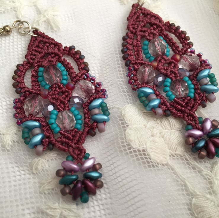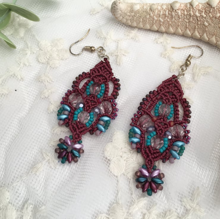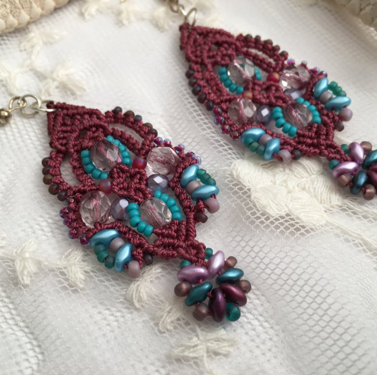 These pretty earrings are created using the delicate art of macrame. I have used strong but light weight C Lon macrame thread and interlaced with a selection of glass beads, including fire polished, Mikuki Superduo and Toho seed beads.