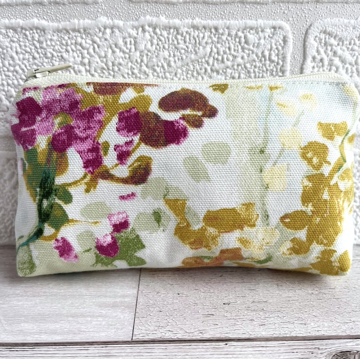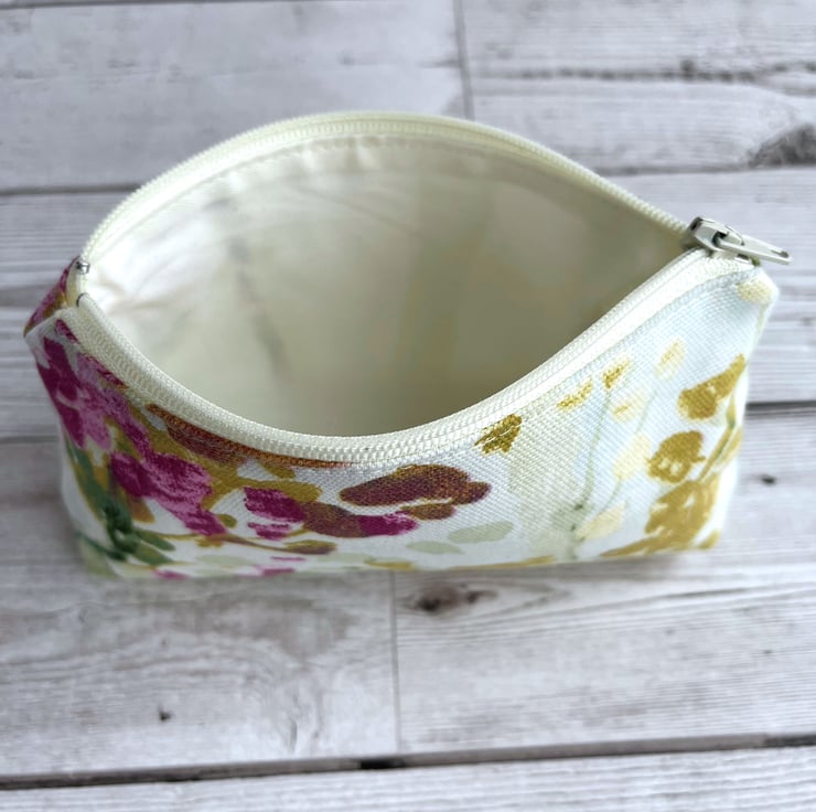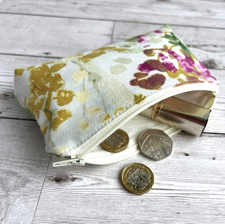 Large coin purse with abstract blossom. This lovely large-sized coin purse is made from a delightful print fabric with an abstract pattern reminiscent of blossom-covered tree branches. The pattern resembles an abstract painting in shades of golden yellow, ochre, pink and green on a cream background. The coin purse has a cream zip and is lined with cream fabric. The base of the purse is boxed to give extra space inside.