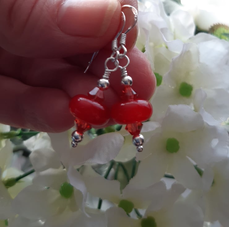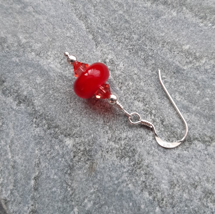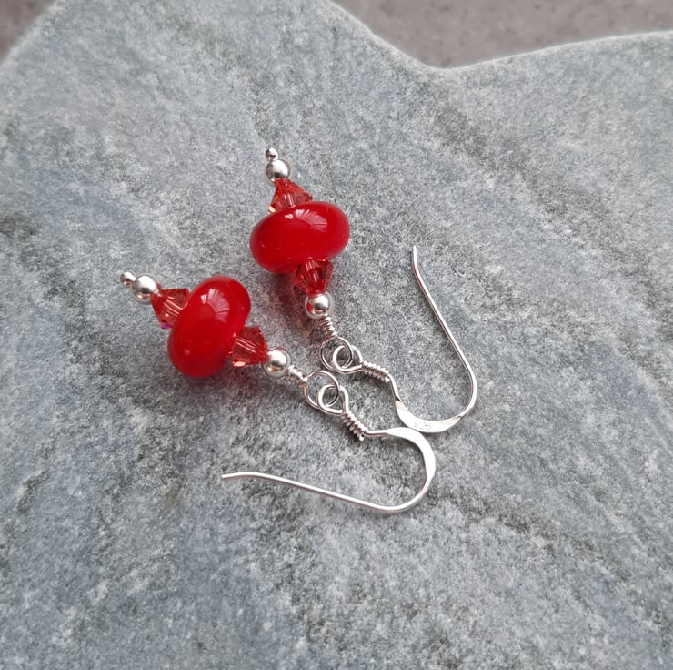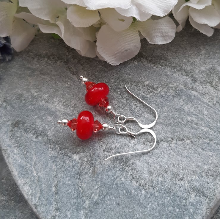 Sterling silver earrings with lovely handmade lampwork glass beads made in the UK which are red in colour with lighter red swarovski® crystals.