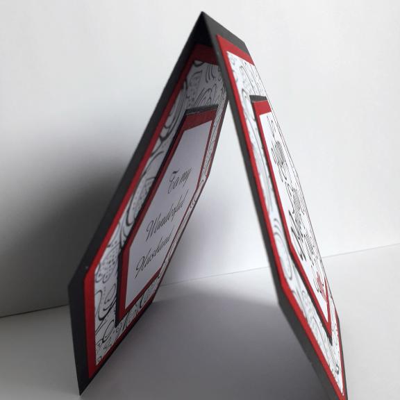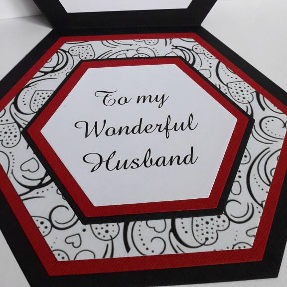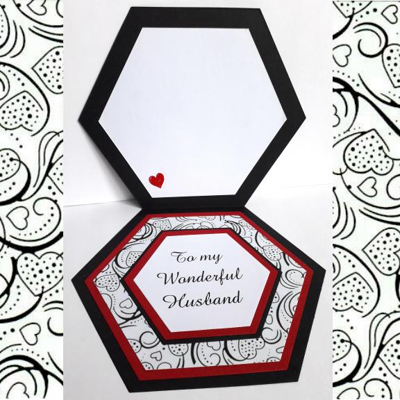 This hexagon shaped valentine card is 16.5 x 14cm, I have placed the large sentiment onto die cut mats of red and black card, then a black and white heart patterned paper, then repeated the red and black mats, there is a red glittery die cut heart at the bottom of the sentiment.