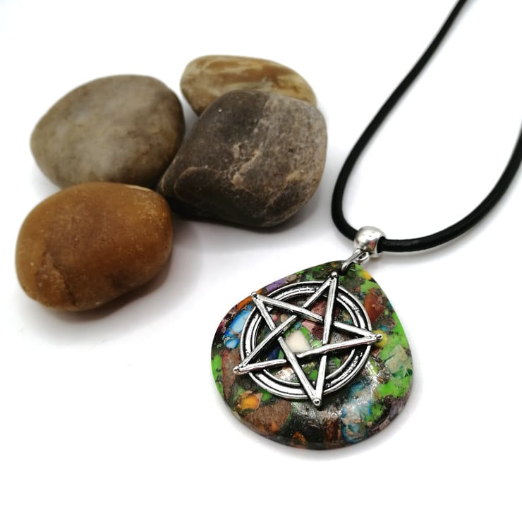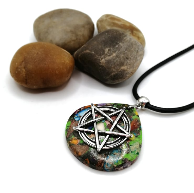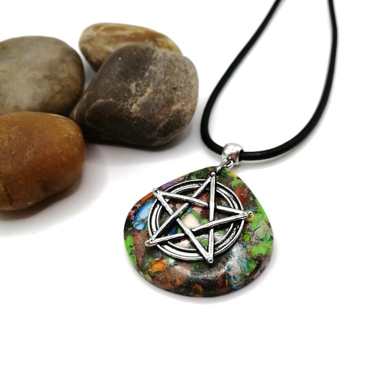 This beautiful necklace is made from multicoloured, sea sediment jasper. The pentacle charm is silver plated. Please leave me a message with your choice of necklace length and type. I am able to offer black or brown leather or silver plated chain. If I don't receive a message I will send a 18 inch black leather necklace.