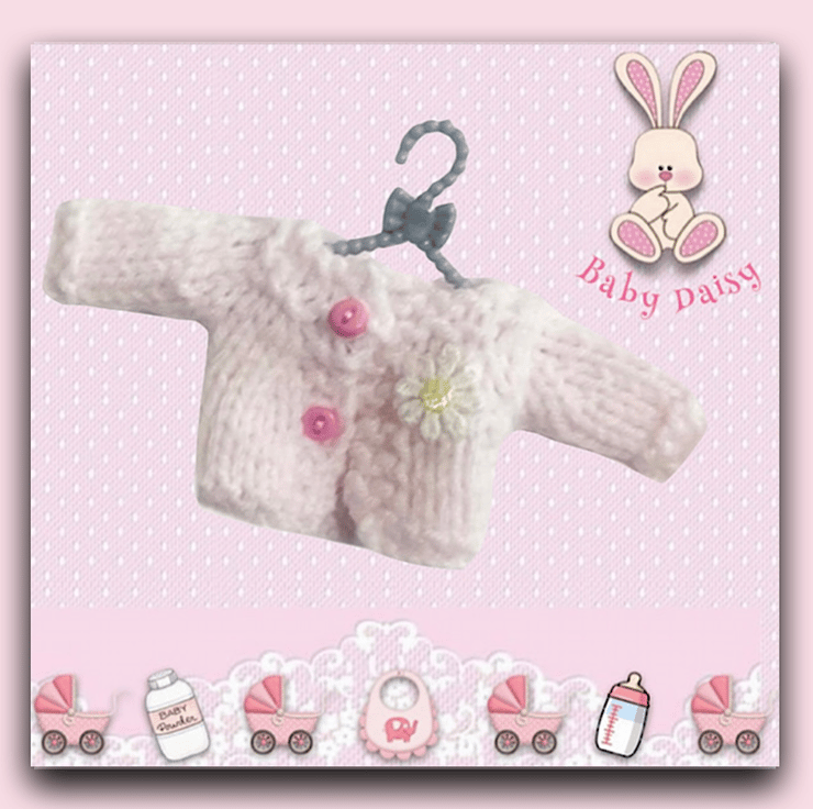 A pretty pale pink cardigan, decorated with a little daisy to fit baby Daisy. The cardigan is hand knitted and comes on a cute little hanger.