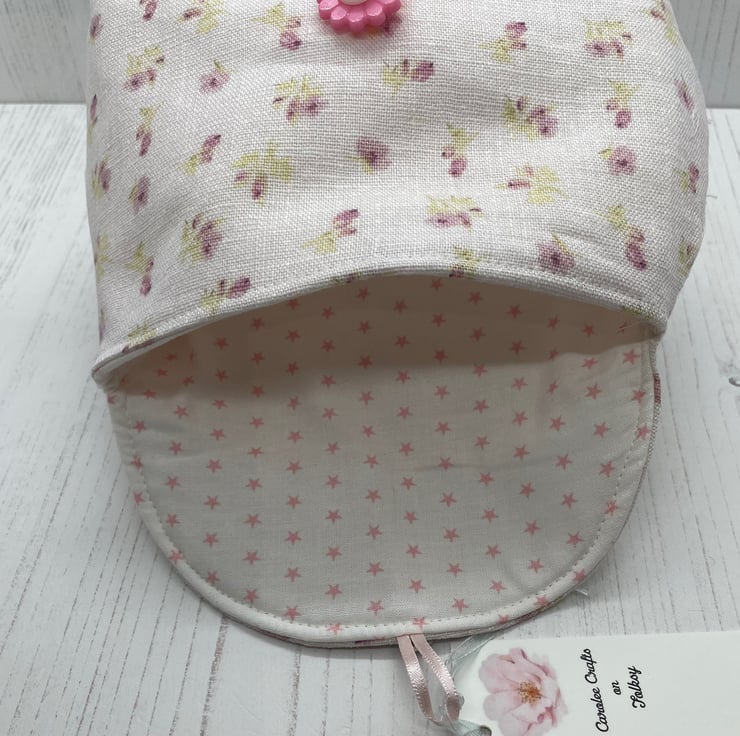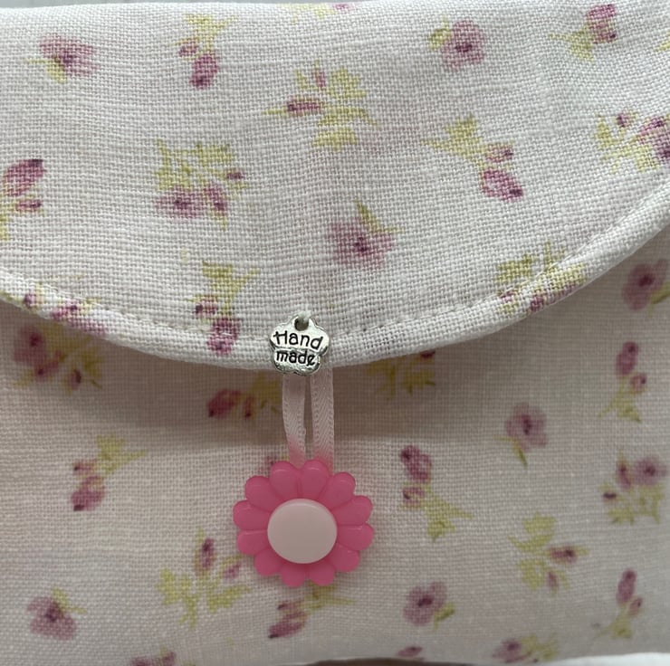Linen fabric in Ivory and tiny pink/ lilac roses. Lined with a white and pink star cotton fabric. Pink floral button to secure shut with pale pink ribbon loop.
