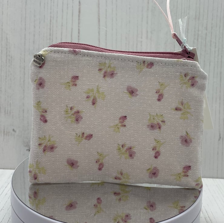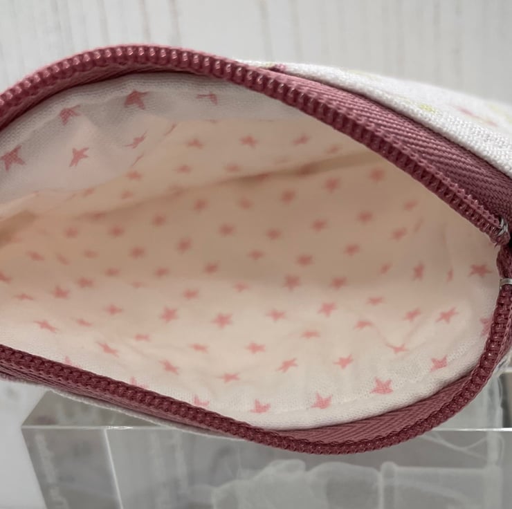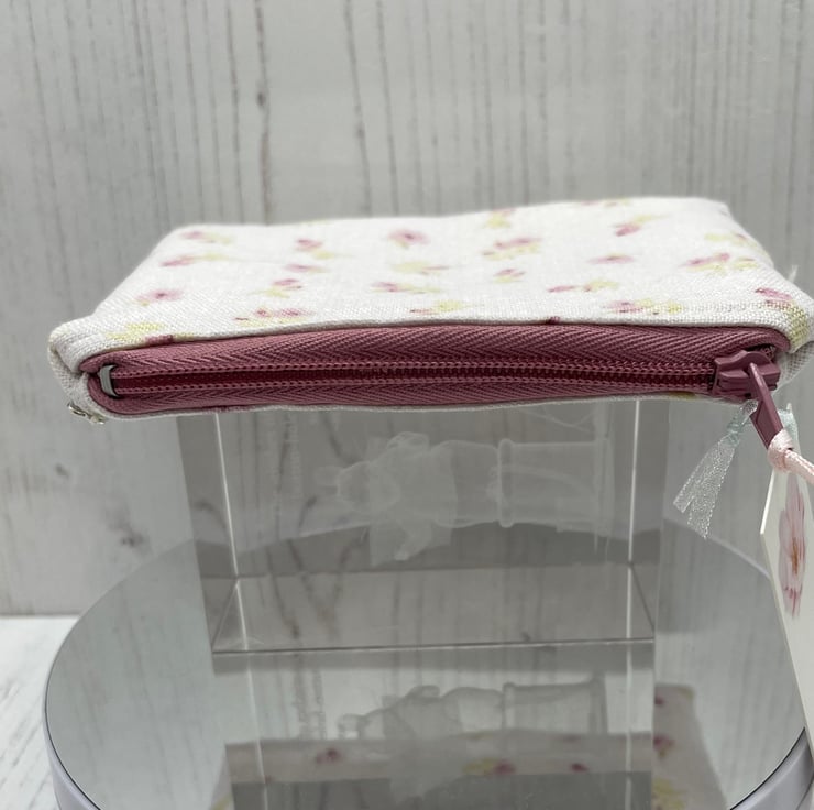 Linen fabric in Ivory with pinky lilac rose buds. Lined with white and pink star cotton. Made into a pretty coin purse. Rose zipper with a length of pink satin ribbon as a zipper pull.