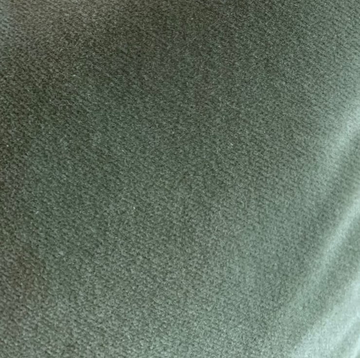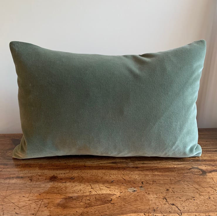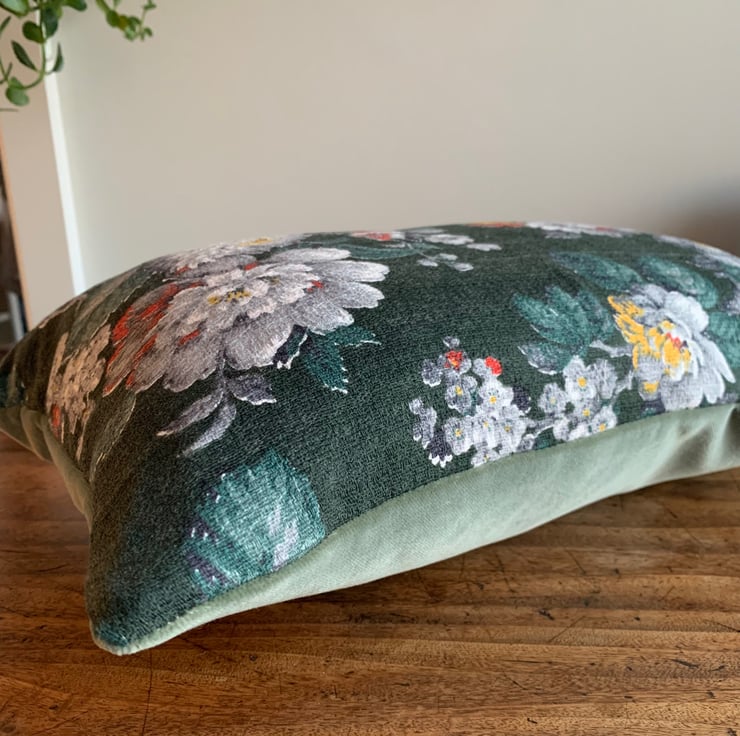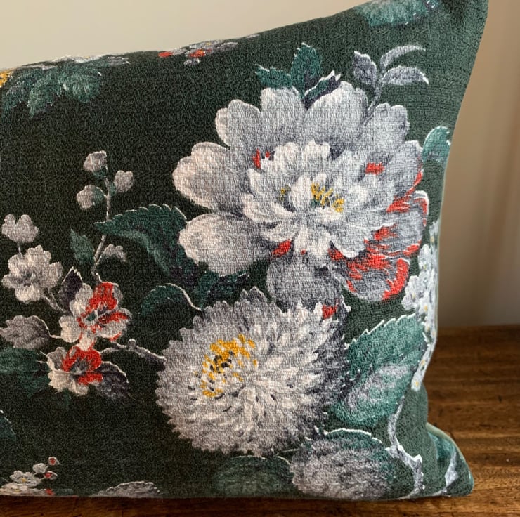 Striking vintage barkcloth cushion cover in dark green with pale grey, yellow and red flowers. The cover is backed with sage green designers guild velvet.