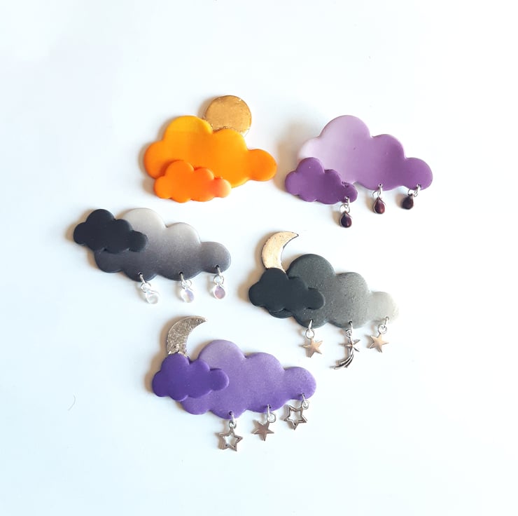 Moon and stars brooch, Dark clouds brooch, Polymer clay pin, Handmade brooch, Quirky badge