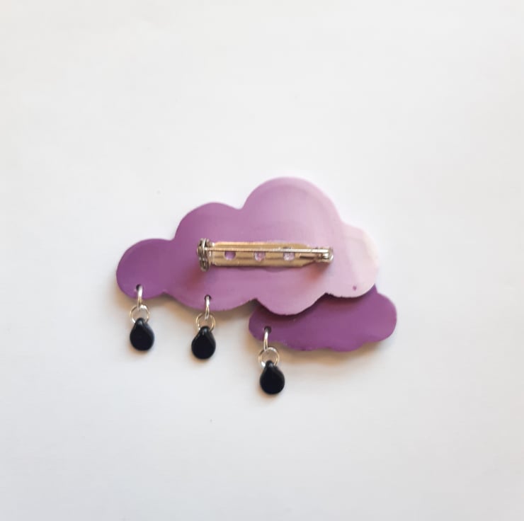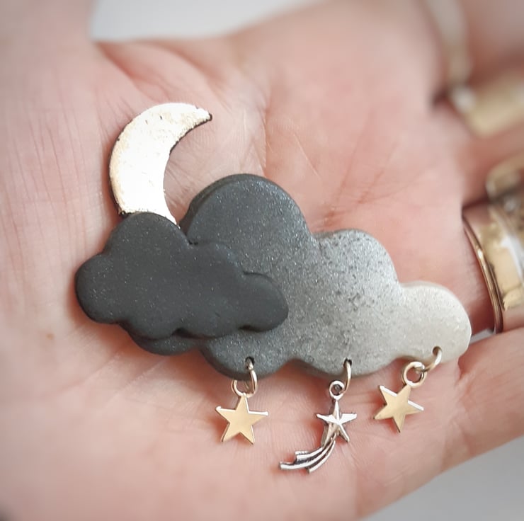 A handmade polymer clay brooch formed into dark clouds with the crescent moon peeping over the top and little silver star charms suspended from the lower edge.