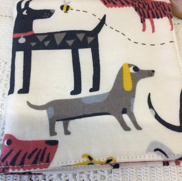 Fabric depicting a fun dog theme on a white background lined with white cotton.