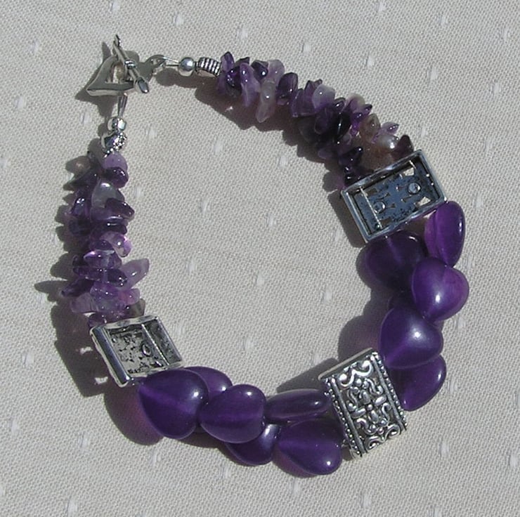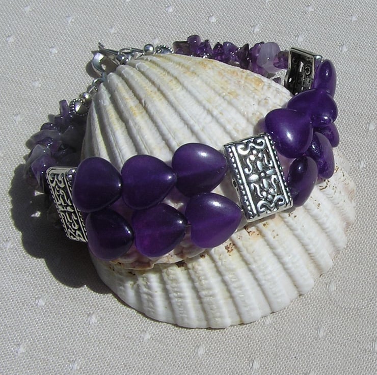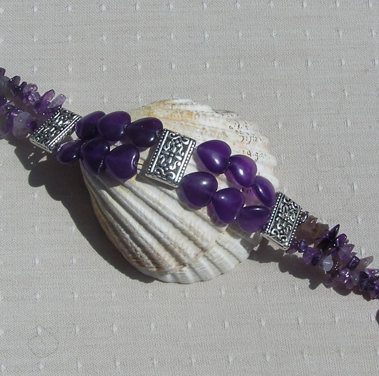 This Stunning Bracelet is made from Beautiful Amethyst Heart Beads and Amethyst Gem Chips… each section separated by an ornately decorated Tibetan Silver Bar Spacer with a tiny Silver Heart at each end - a Beautiful combination that will look stunning either worn casually or with something more Elegant for a Special Evening out