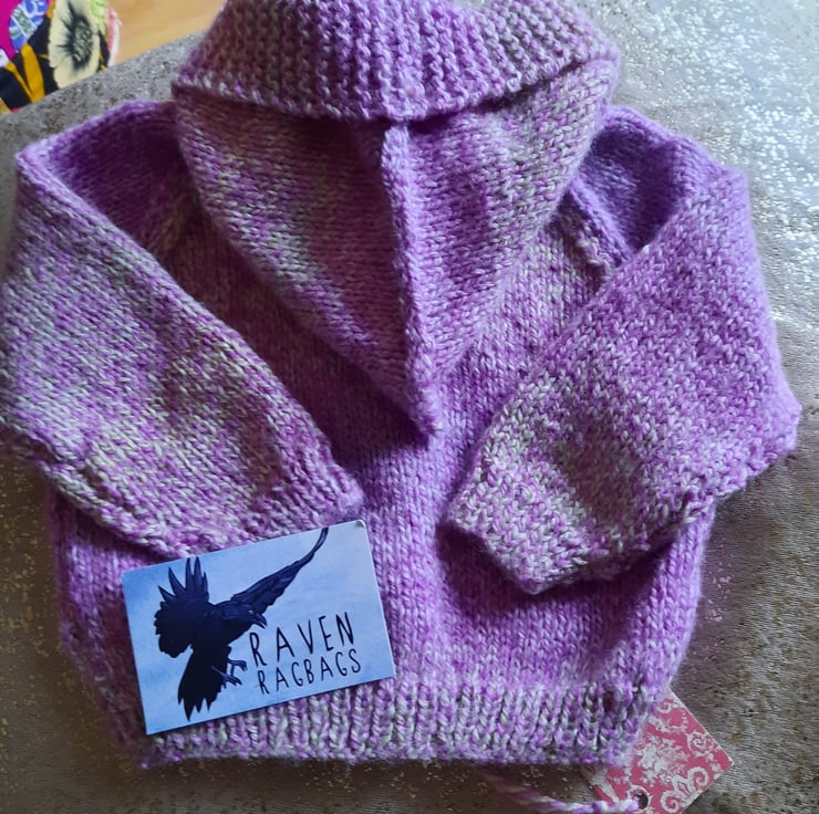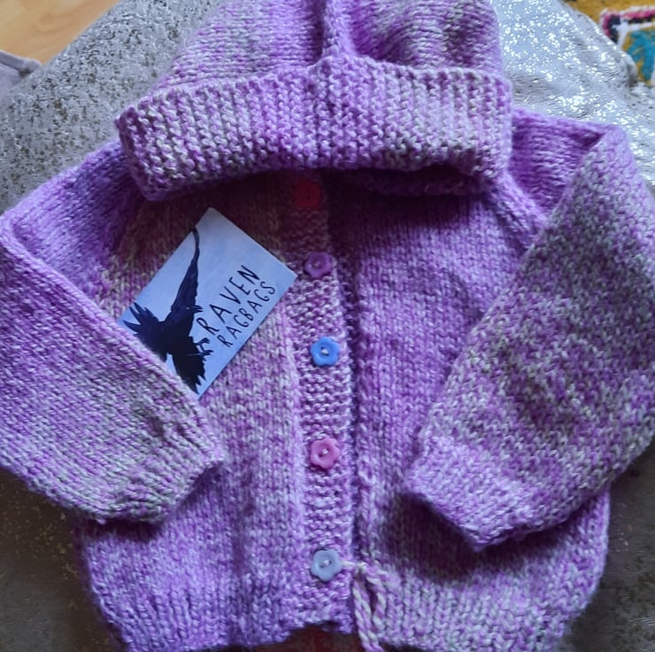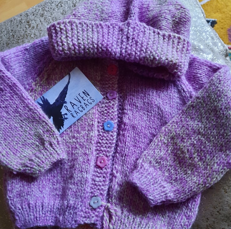 A beautiful soft pink marl yarn makes this little baby hoody so pretty and snuggly to wear. hand knitted in soft-feel easy care acrylic blend this cute little jacket washes at 30 degrees centigrade and vegan friendly too. Five little pastel flower buttons and a cosy hood will make sure your precious little one stays warm and toasty this Winter. To fit chest 18 to 20 inches approximately 6 to 9 months back length 10 inches sleeve length 9.5 inches.