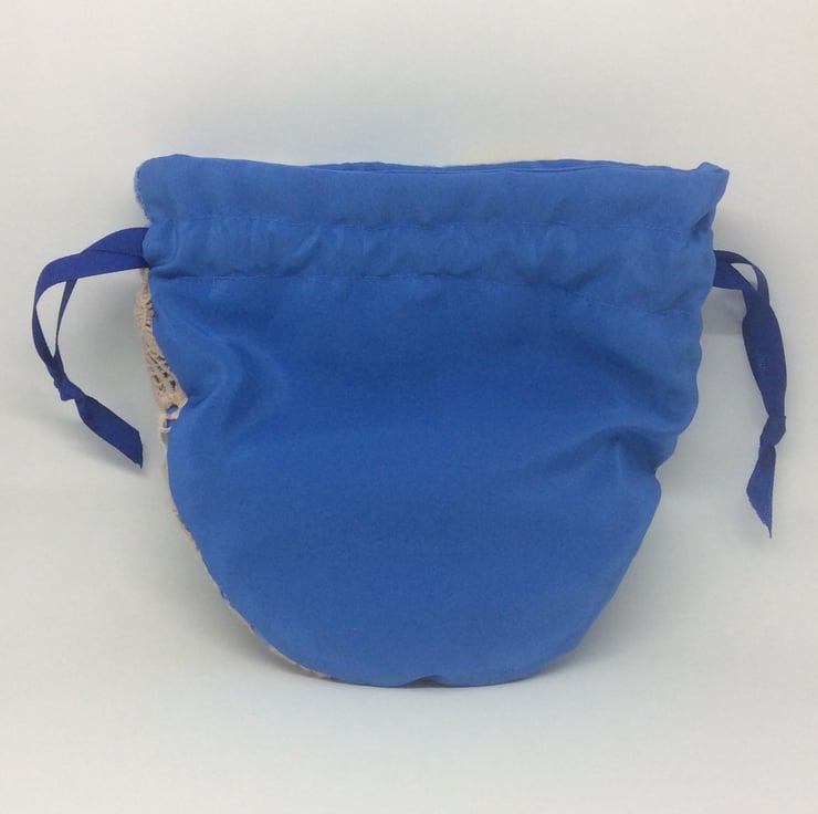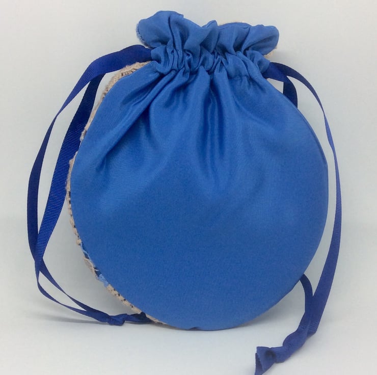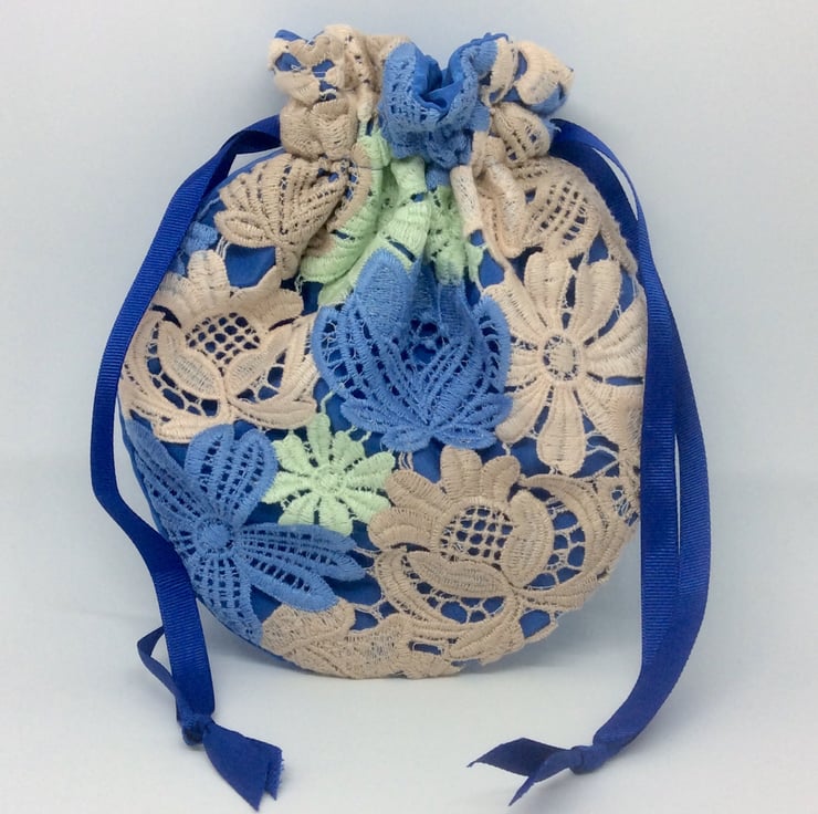 This dainty and elegant drawstring bag or Potli is one of a kind and would be unique to you. Perfect for a wedding or for any special occasion. The bag is a mid blue silky fabric overlaid on the front with repurposed peach, beige, blue and light green lace flowers. It is lined with the same mid blue fabric and has a double drawstring closure of blue ribbon. The bag measures approximately 20cm x 20cm.