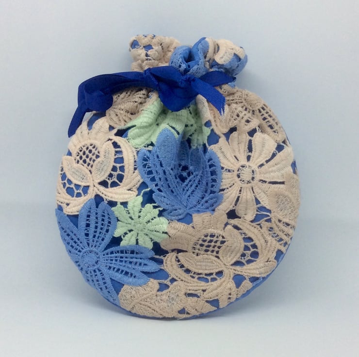 Small, drawstring Potli, wristlet bag, lace flowers on blue.
