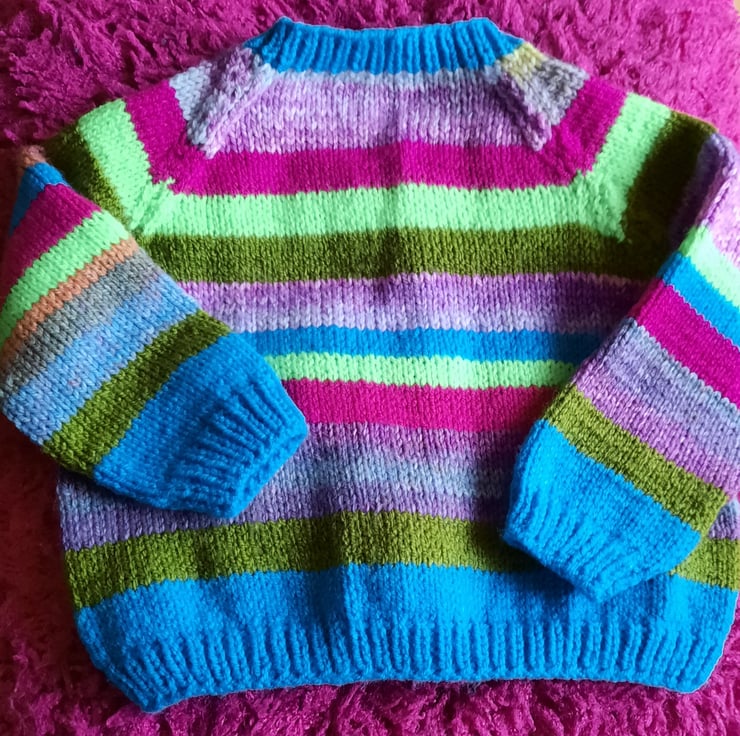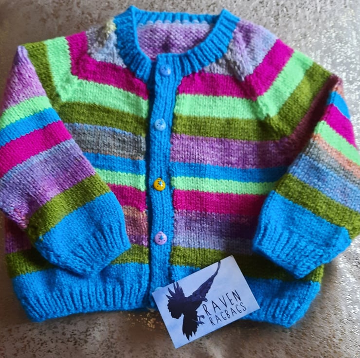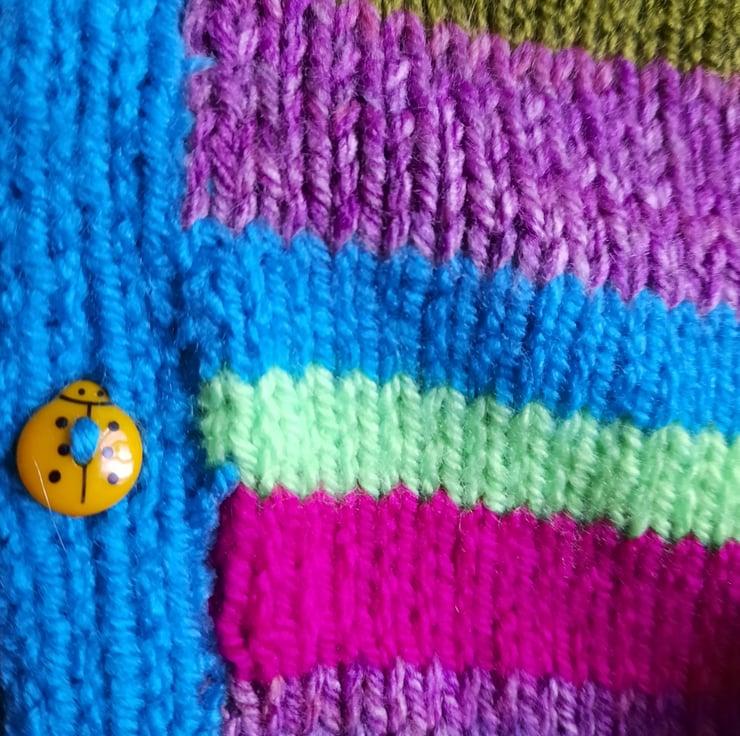All things bright and beautiful! Gorgeous rainbow stripes to brighten up the cold Winter months for this cute little toddler cardigan. Hand knitted in soft acrylic, vegan friendly yarn, it washes at 30 degrees centigrade. Five sweet little ladybird buttons complete this stylish cardigan and give it a touch of original style. your little one will love it! To fit chest 22 to 24 inches, back length 12 inches and sleeve 8 inches approximately 18 months.