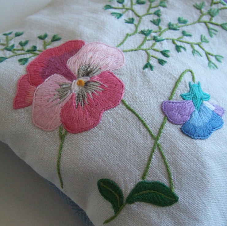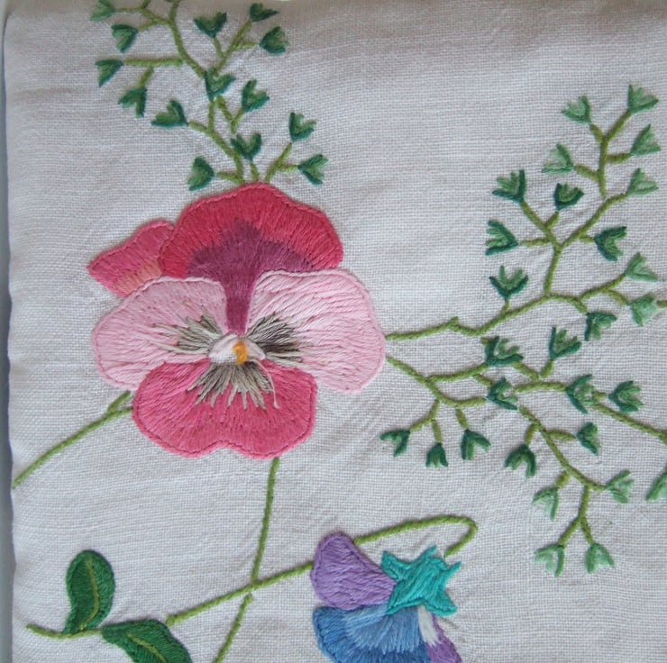 I just love it when these these old table linens turn up at car boot sales. After some gentle soaking and TLC these beautiful pansies emerged, stitched by a highly skilled needlewoman. Its nice to think they can be appreciated once more. There is a matching lavender bag in my shop too.