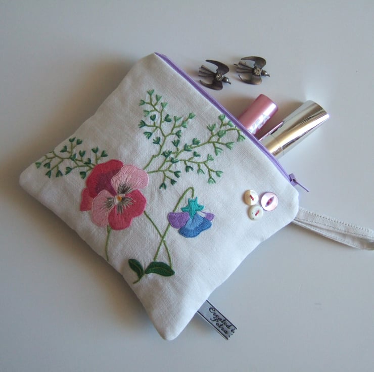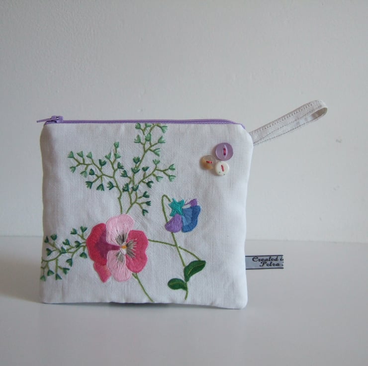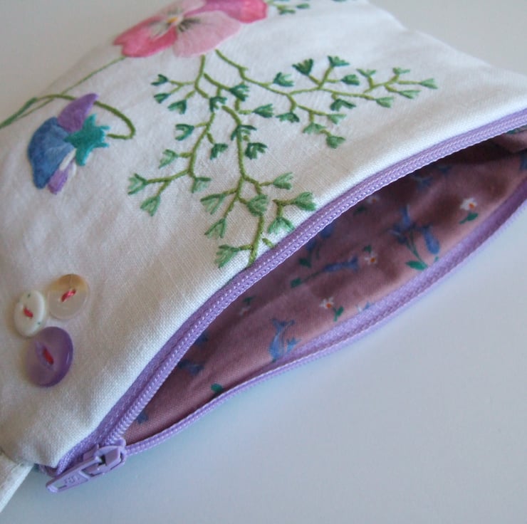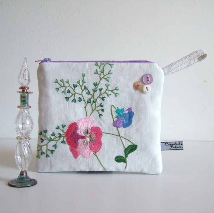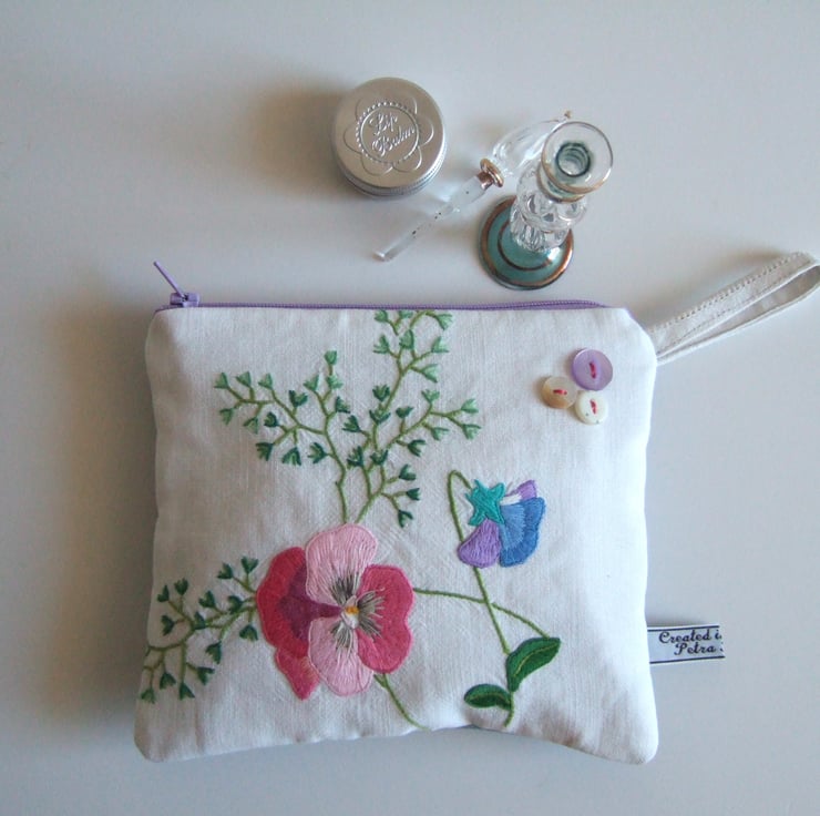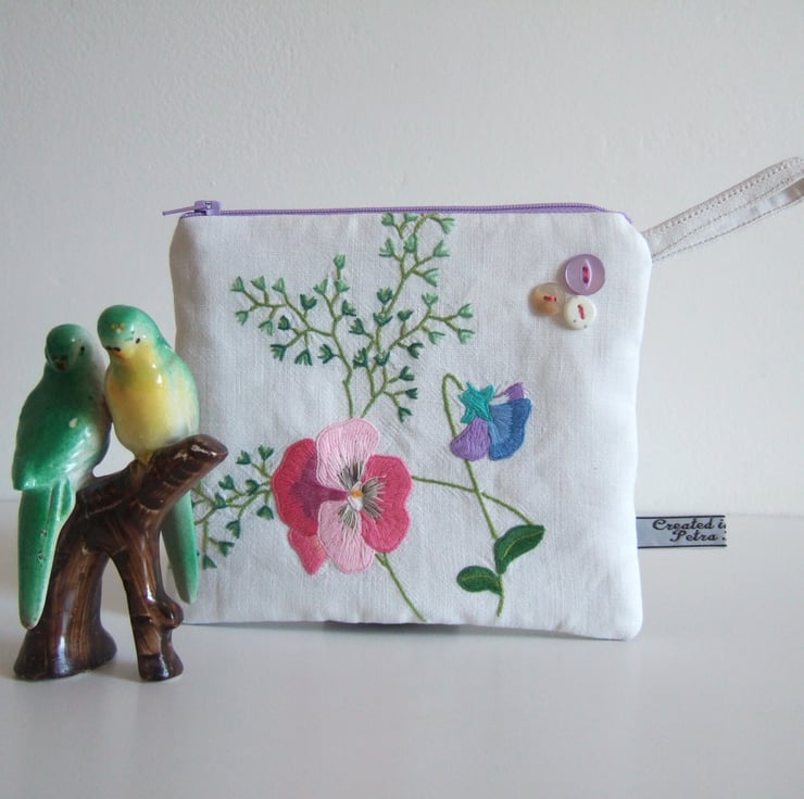 A pretty little bag embroidered with pansies from the corner of a vintage handstitched tablecloth. This piece of old table linen was beautifully worked with these lovely pansy designs. Altho it had seen better days, there were enough fragments to make into a set of sweet little bags. Perfect for make up or storage, they would make a lovely present for a bride to be, as a special birthday present for a friend, or as a Mothers day gift.
