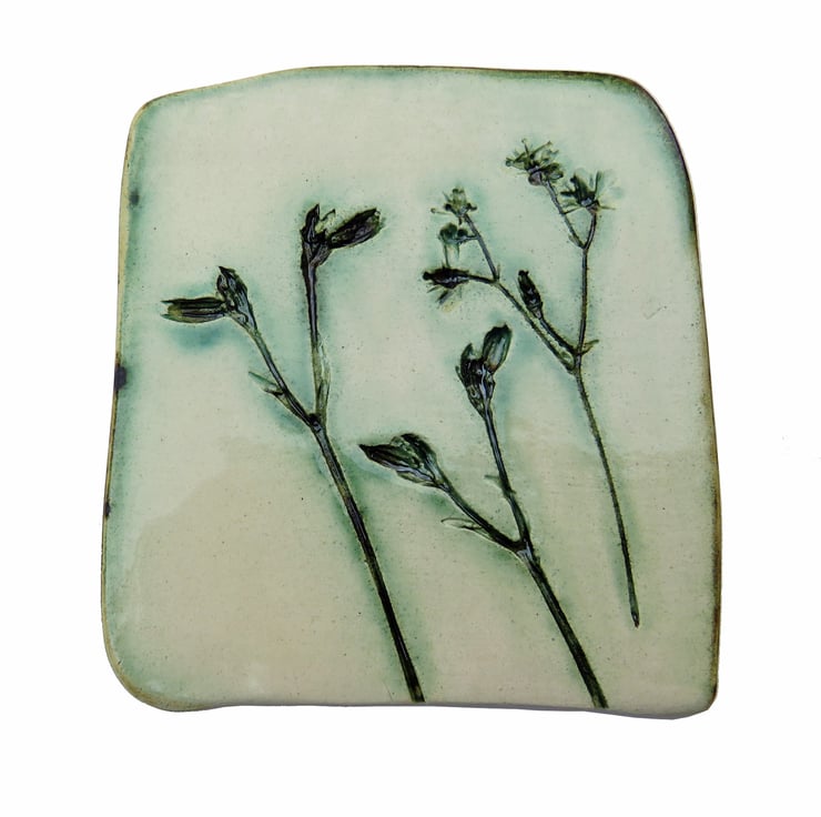 This decorative ceramic tile is impressed with early autumn grasses from the edges of my garden. It is decorated with my own unique sustainably made homemade stain made from copper scraps and finished off with a rich clear glaze.